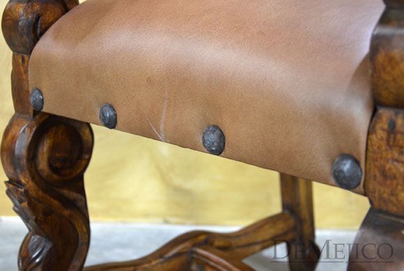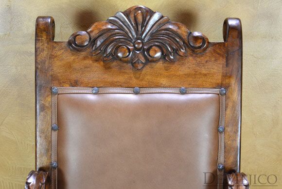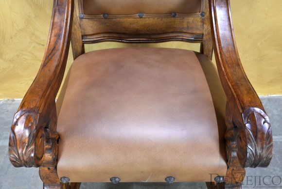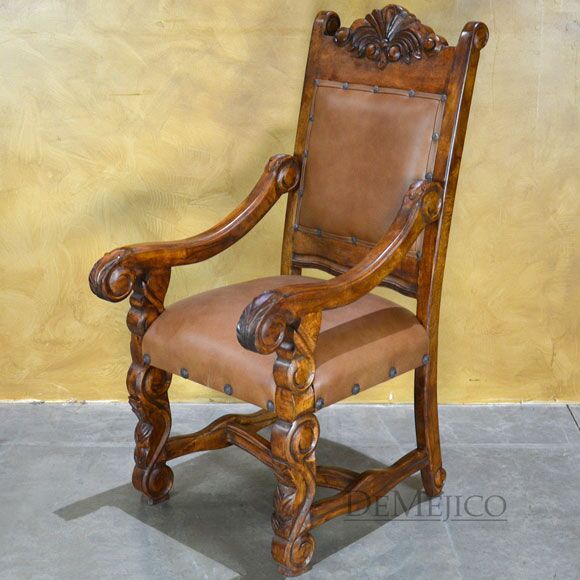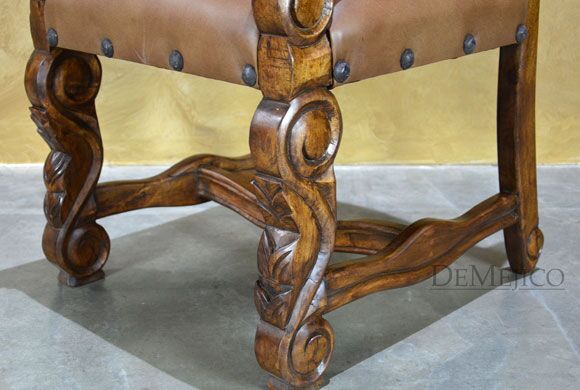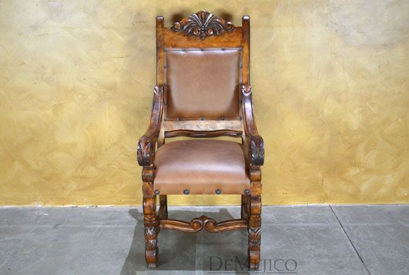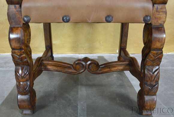 The Silla Hoja with Arms is a beautifully carved elegant Spanish chair with strong Spanish influence. Carved from solid mesquite wood, this chair features hand carved legs and a centerpiece. Also upholstered with a soft-aged vintage leather, this Spanish carved dining chair is finished off with a hand-stitched seat, pounded with iron accents, bringing in both style and comfort.