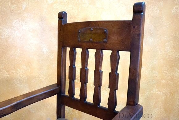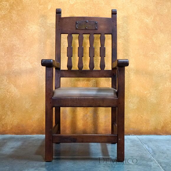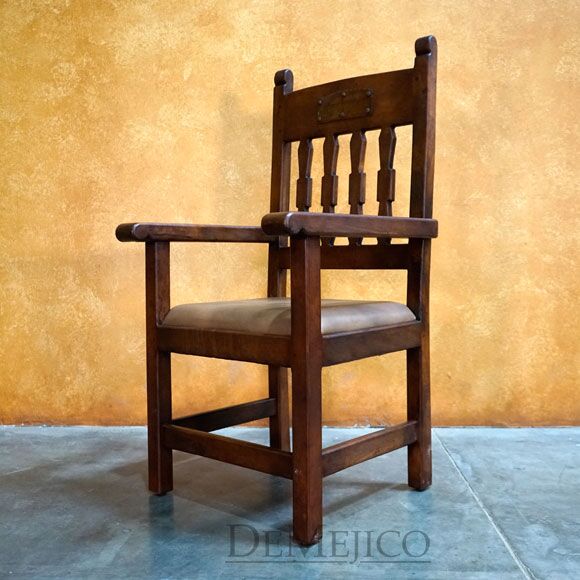 Made from solid mesquite wood, the Silla San Felipe Southwest chair features smooth Spanish lines with a unique bar backing. With a smooth leather seat perfect for restaurant seating, the Silla San Felipe with Arms is finished off with a hand-pounded iron plated back.