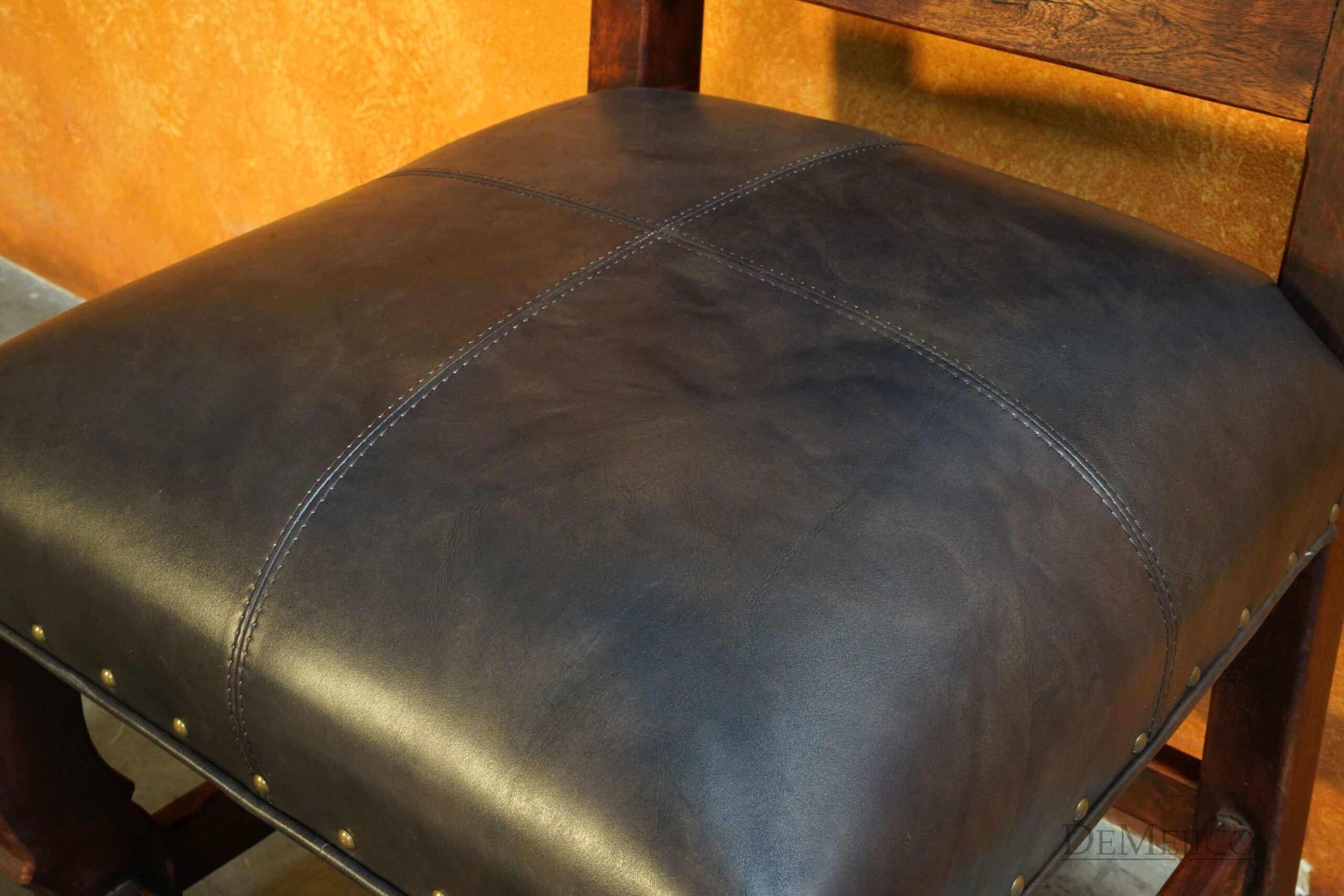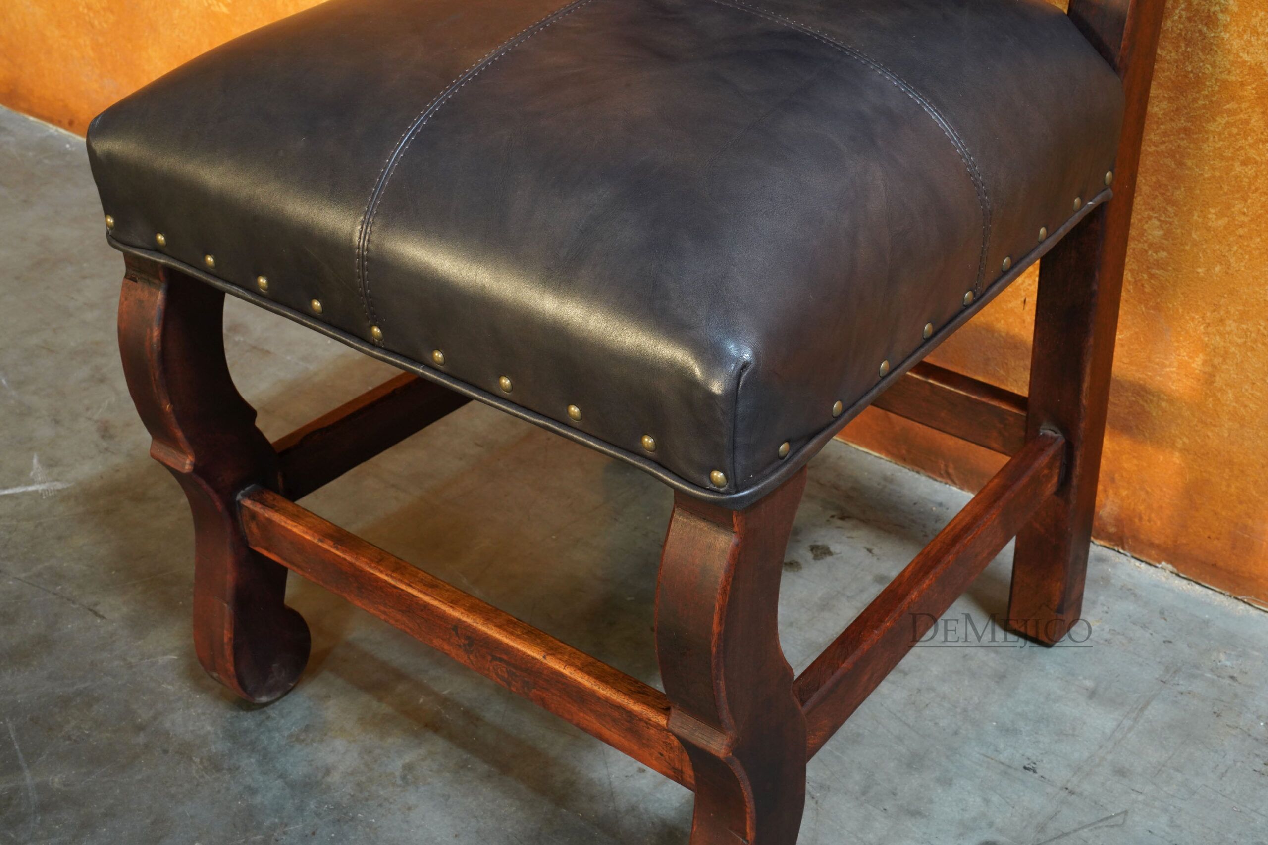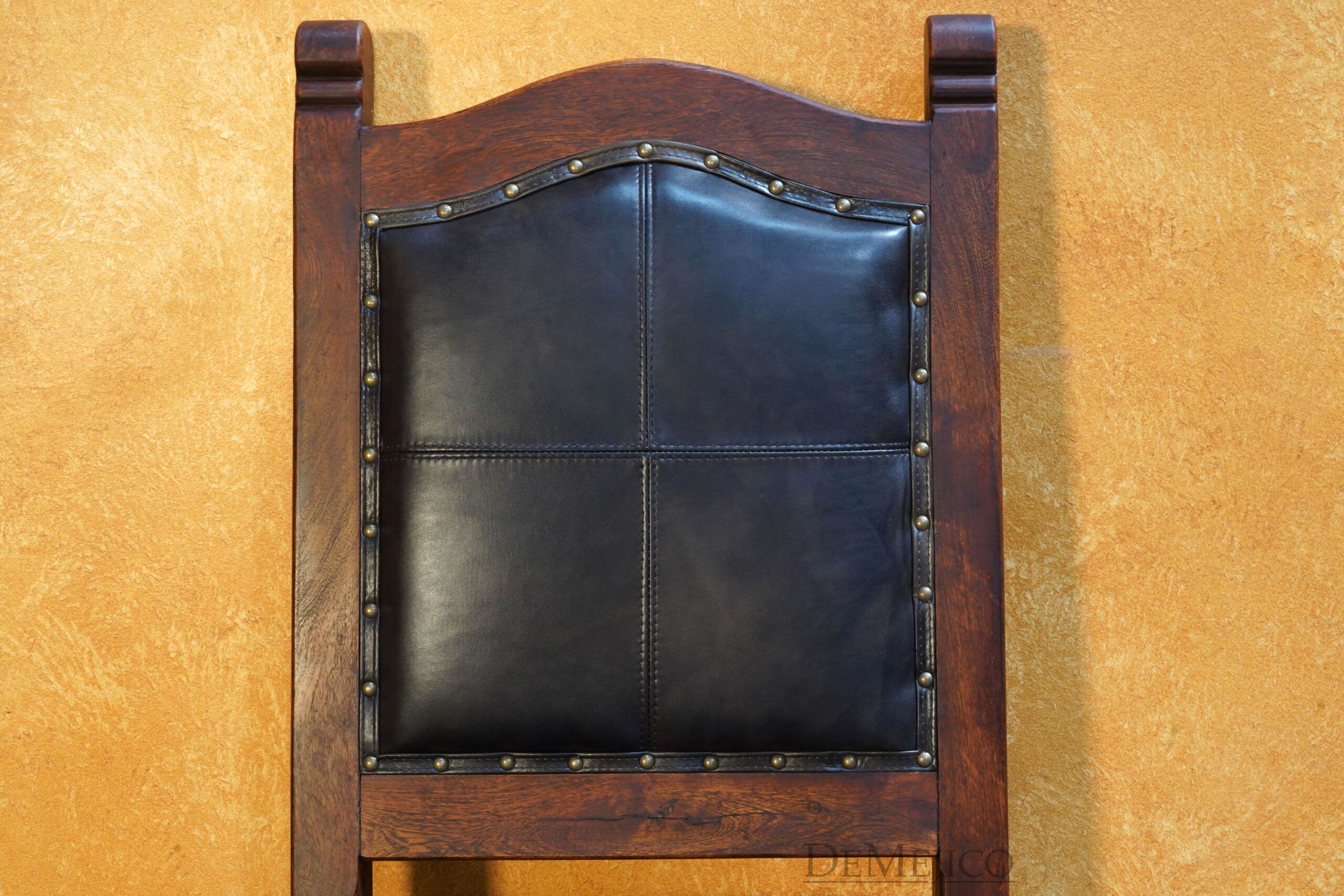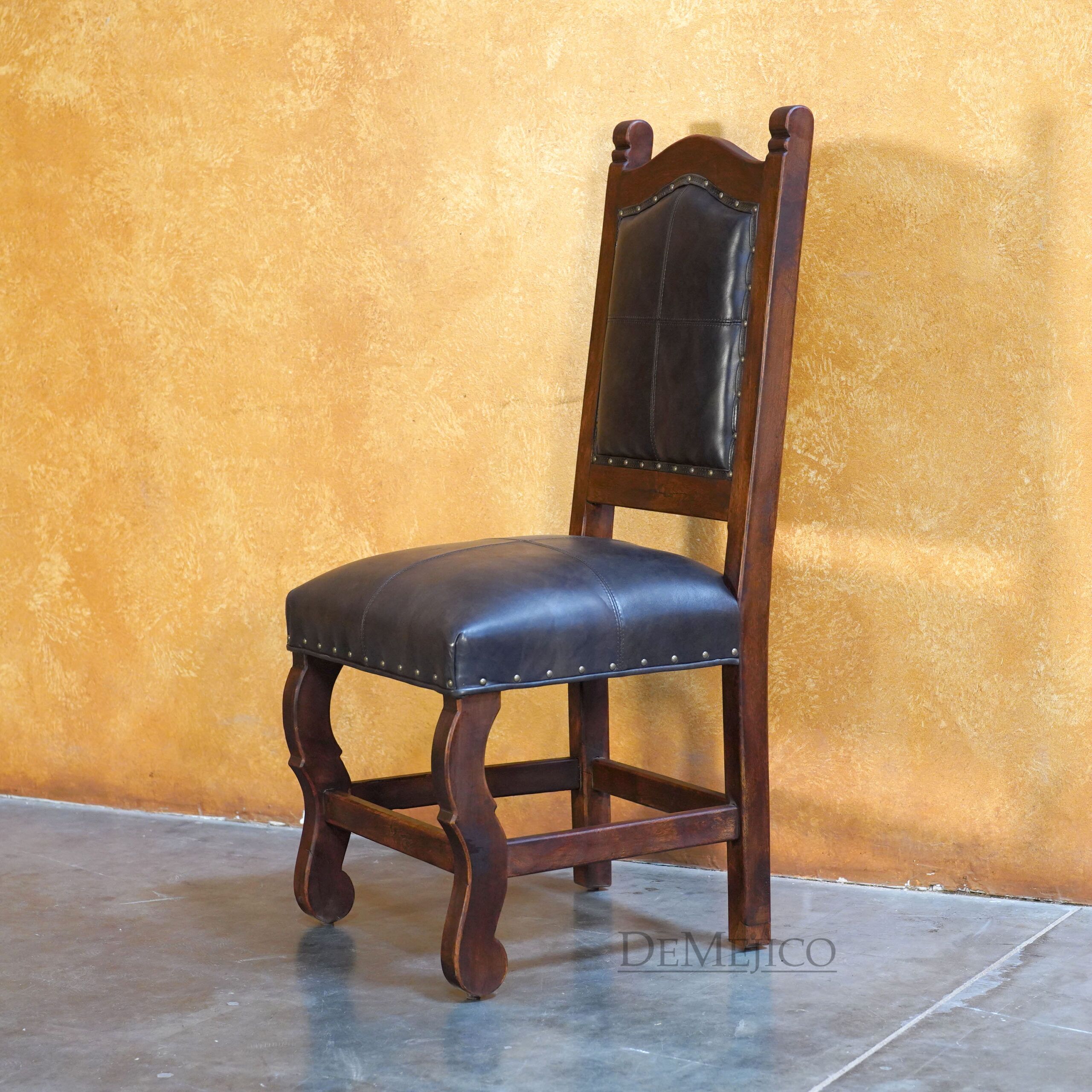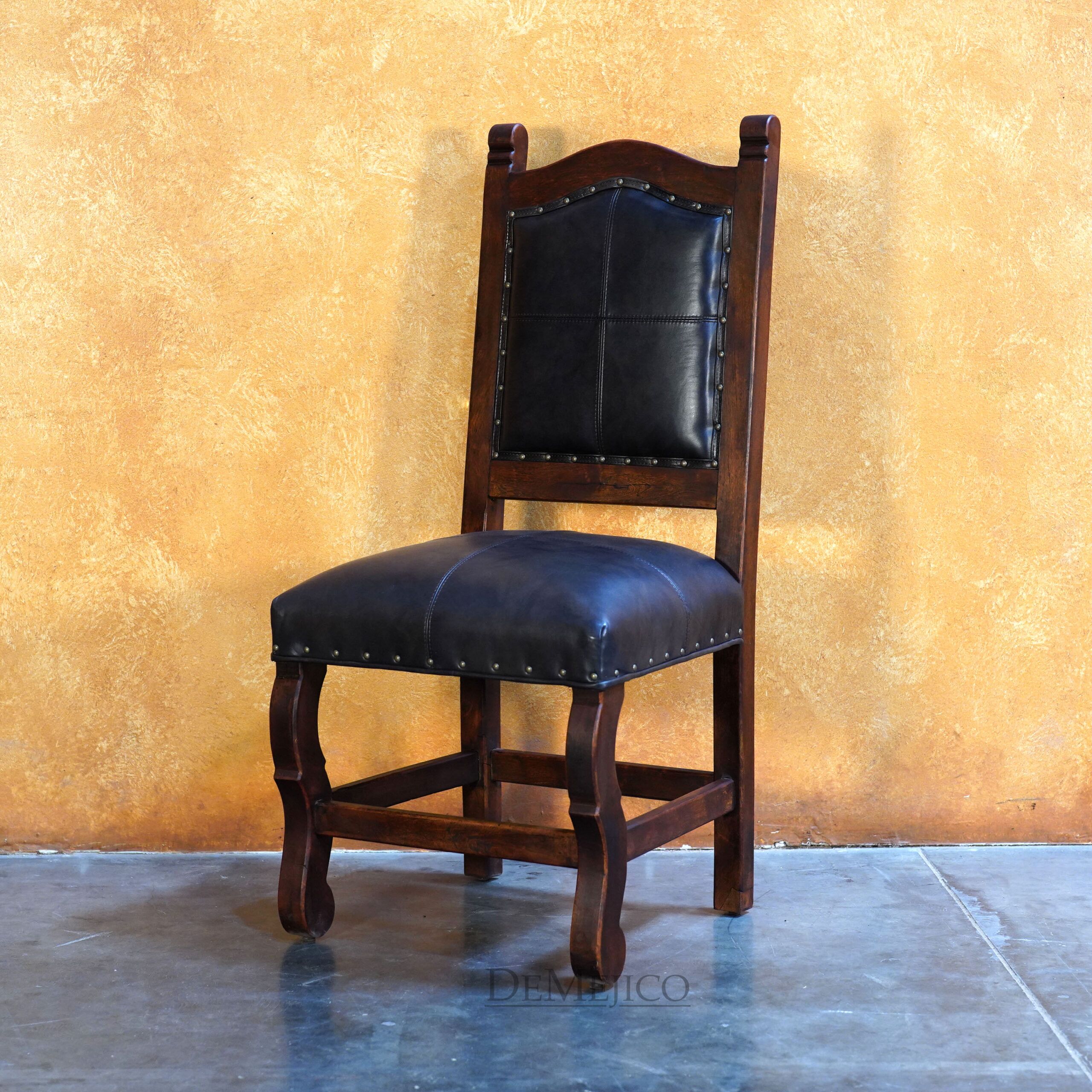Featured in our Dining Catalog, the Silla Santa Paula represents classic Spanish leather dining chairs. Complete with pounded golden accents, the soft lines of the solid mesquite wood paired with a hand-stitched leather seat and backrest allow this chair to be paired with any dining table to create a very formal, or casual dining space.