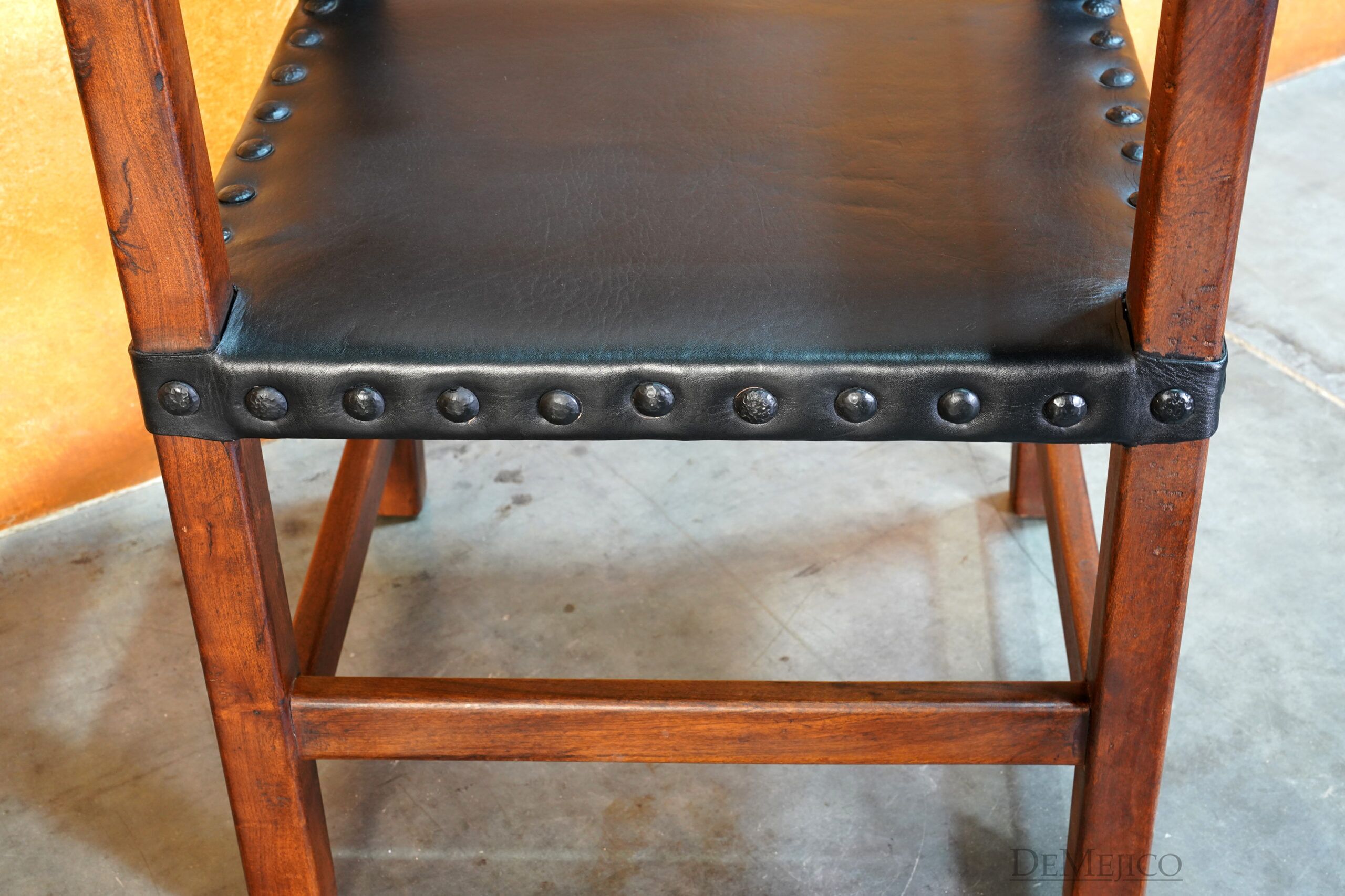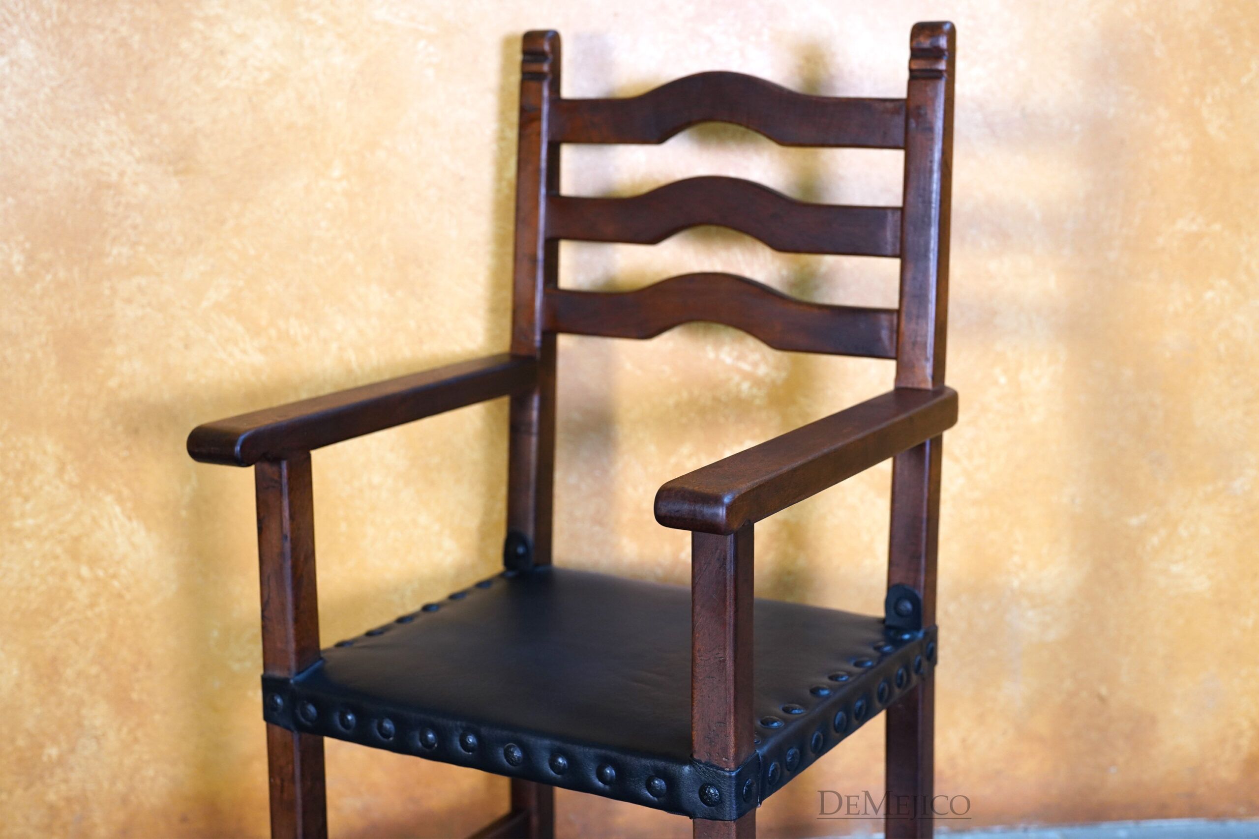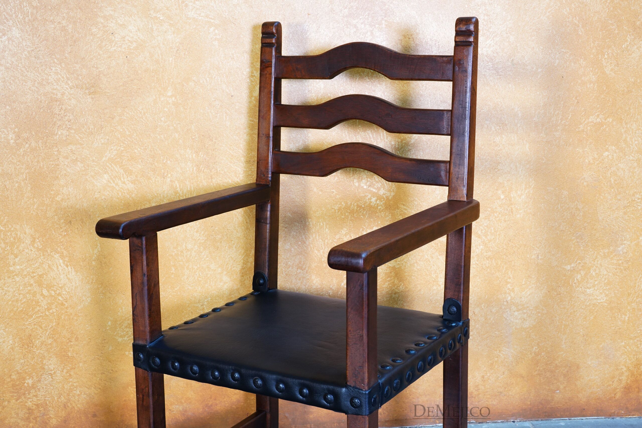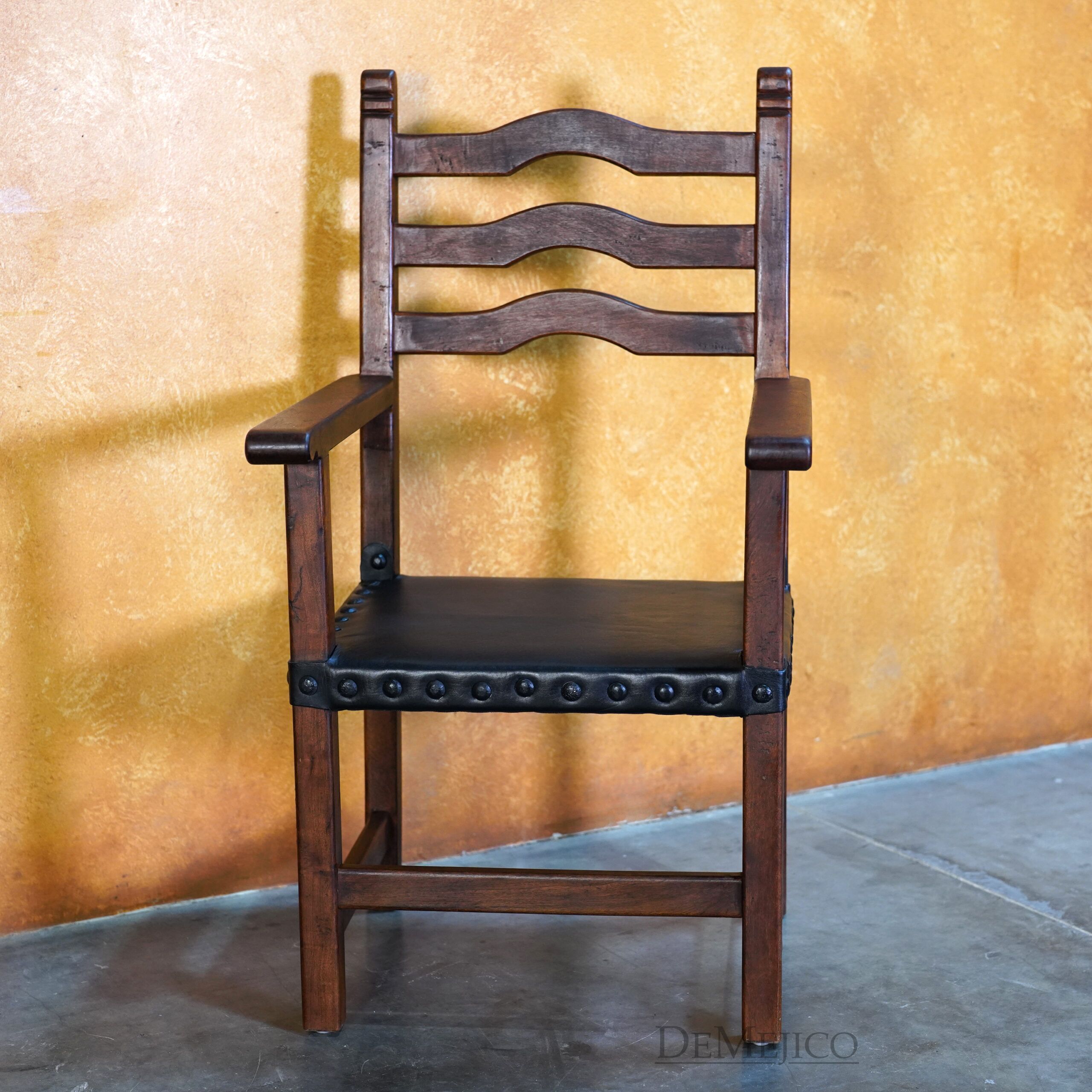 The Silla Teco Leather with Arms is a traditional Spanish style chair, crafted from solid mesquite wood. Just like our original Silla Teco chair, this Hacienda style wood ladder chair showcases soft Spanish arches, clean lines and solid construction, plus a soft leather seat for extra comfort. Perfect for restaurants, kitchen settings, or any casual dining space, the Silla Teco Leather with Arms is both stylish and comfortable.