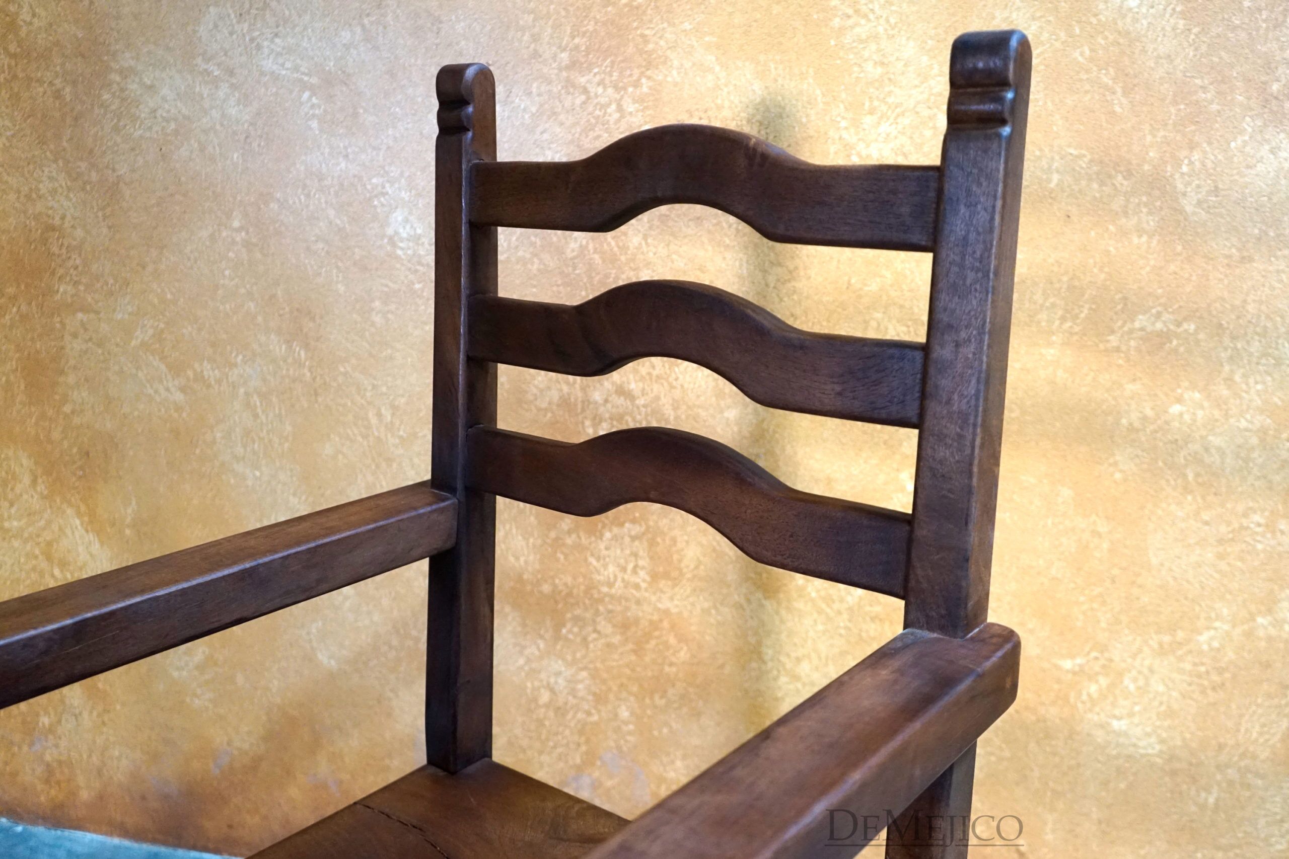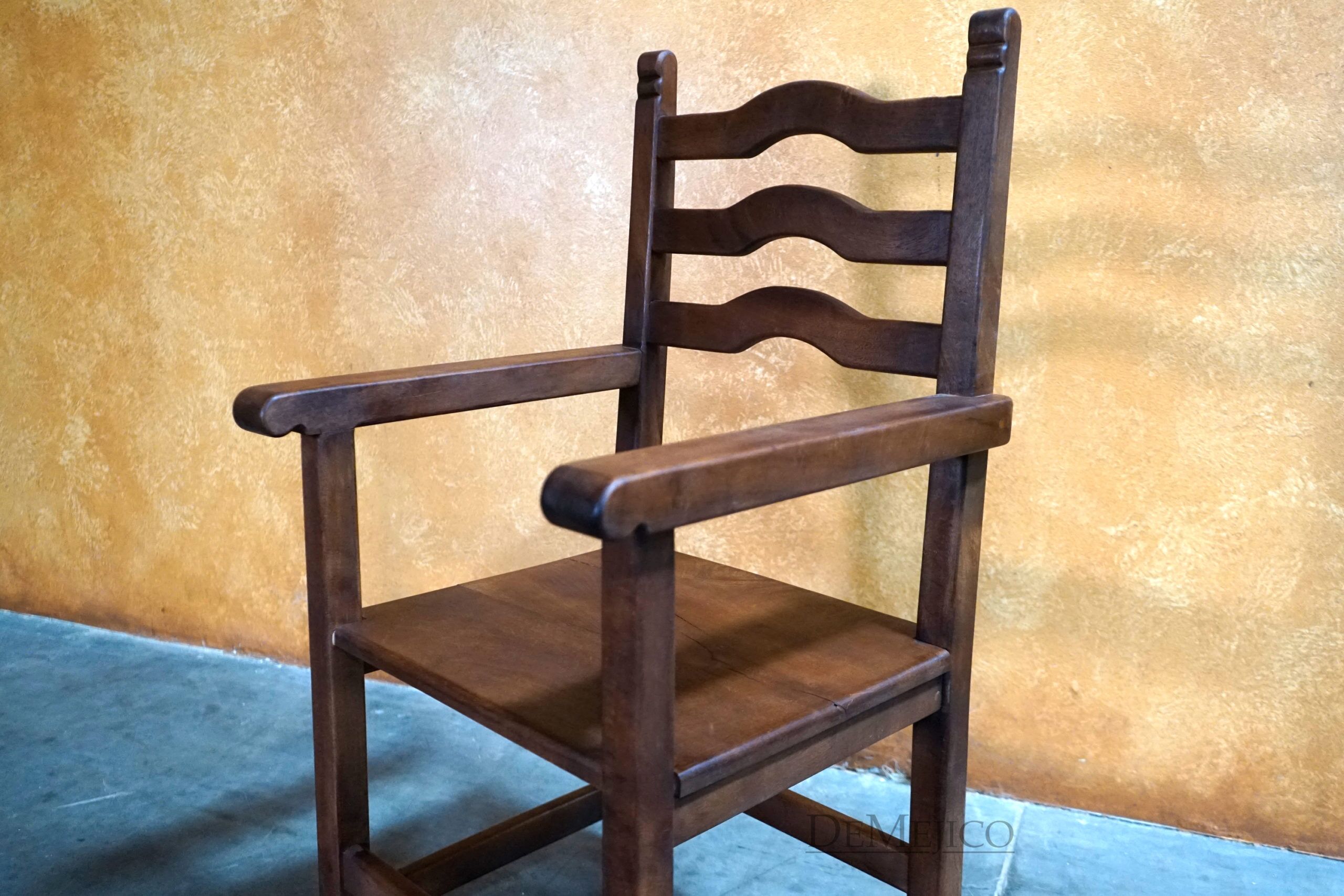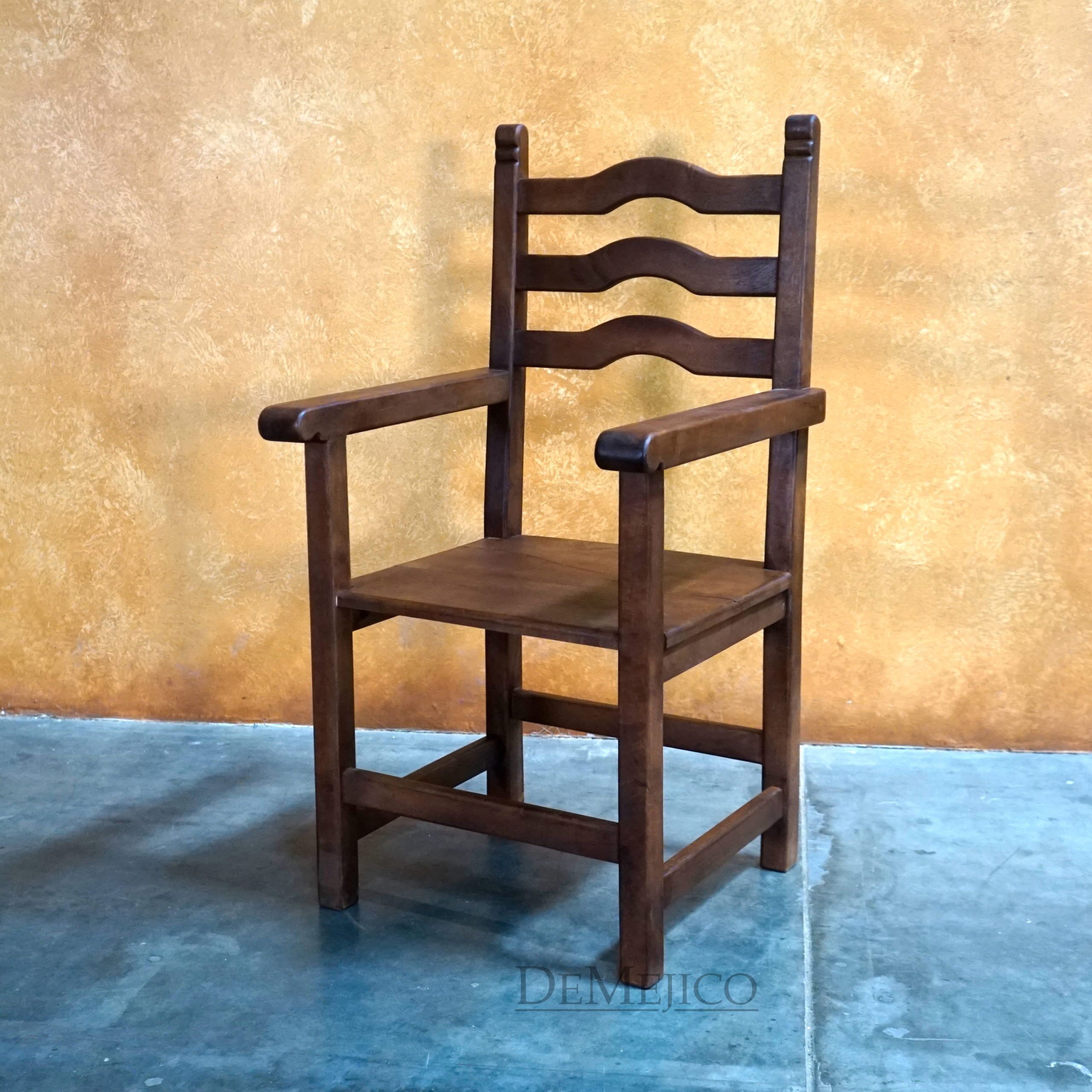 The Silla Teco with Arms is a traditional Spanish style chair crafted from solid mesquite wood. This Hacienda style wood ladder chair showcases soft Spanish arches, clean lines and solid construction, making it perfect for restaurants, kitchen settings, or any casual dining space.