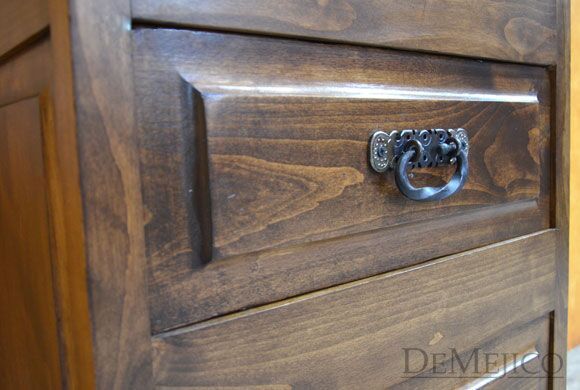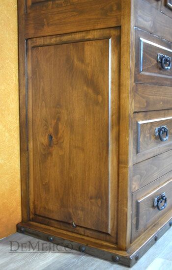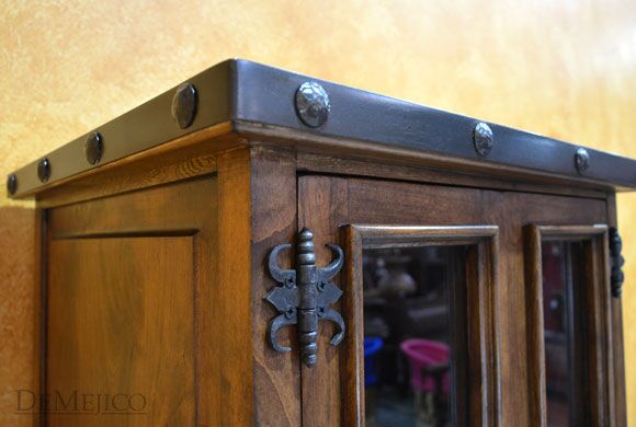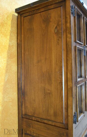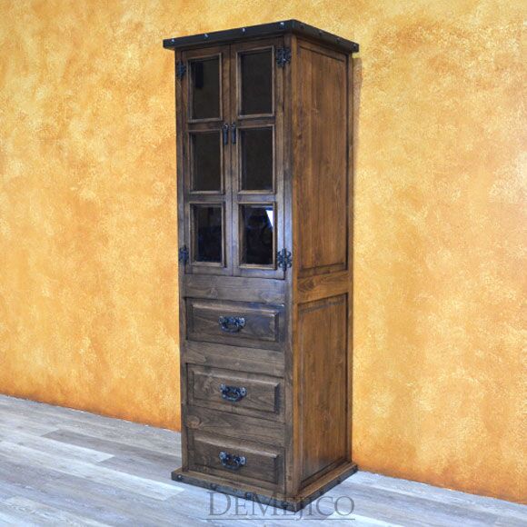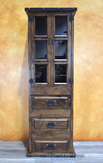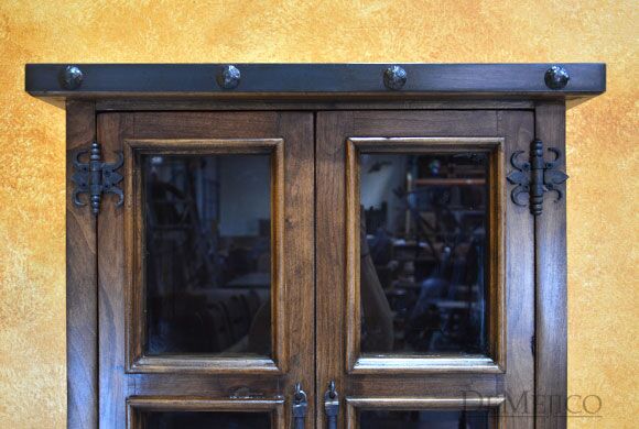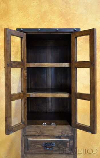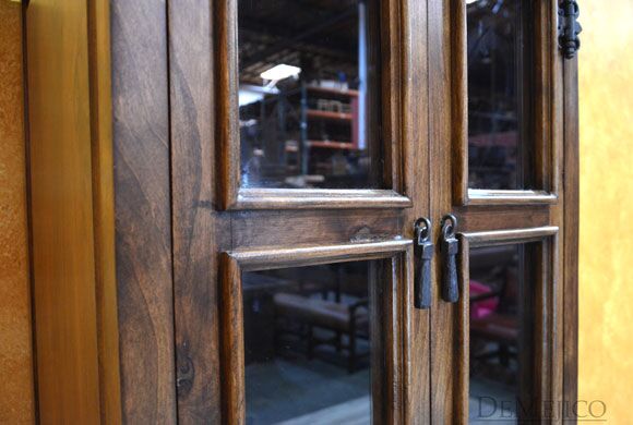 A unique addition to our Dining Room Catalog, the Small Alamo Hutch is a small Spanish hutch, designed with touches of our classic “Alamo” style. Made from solid alder wood and featuring paneled glass windows, this Spanish hutch stands out among the rest. On top, the two paneled doors open up to two added shelves, for storage/display. Below, three raised panel drawers provide even more display, and all are accented with hand forged iron hardware. Finished off with raised panels on the sides, this glass panel hutch would be a beautiful addition to any Spanish style dining or entertainment space.