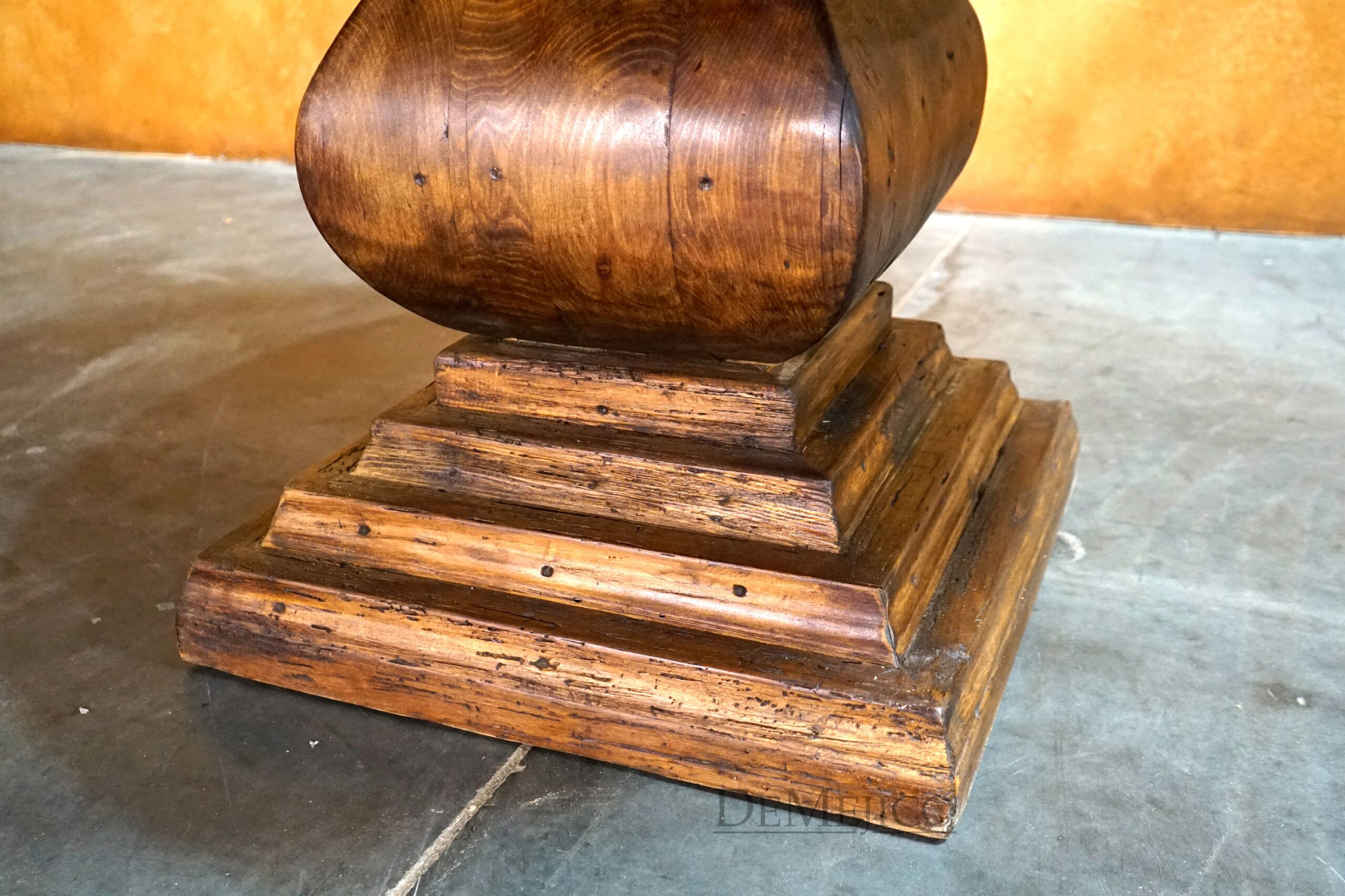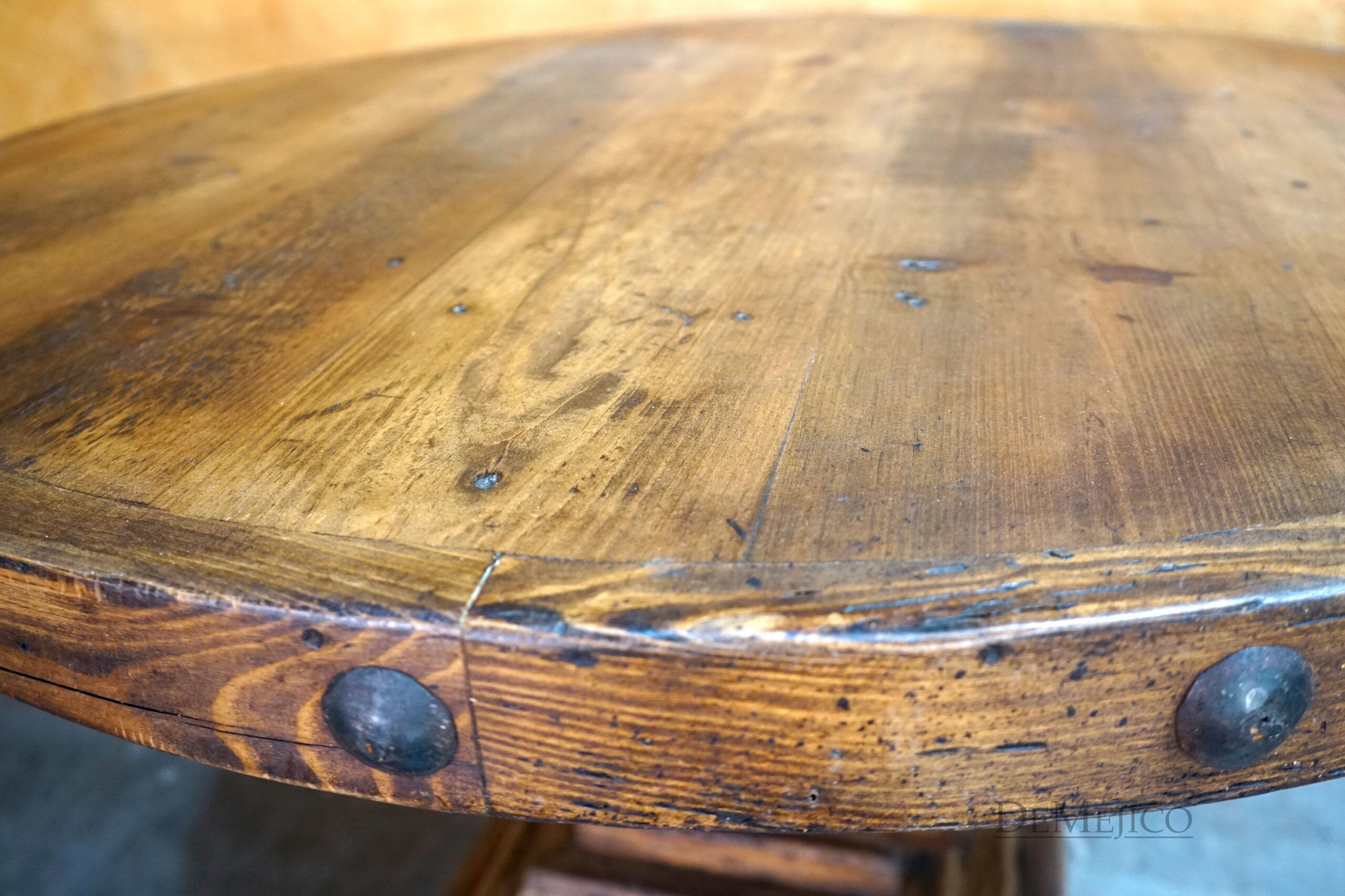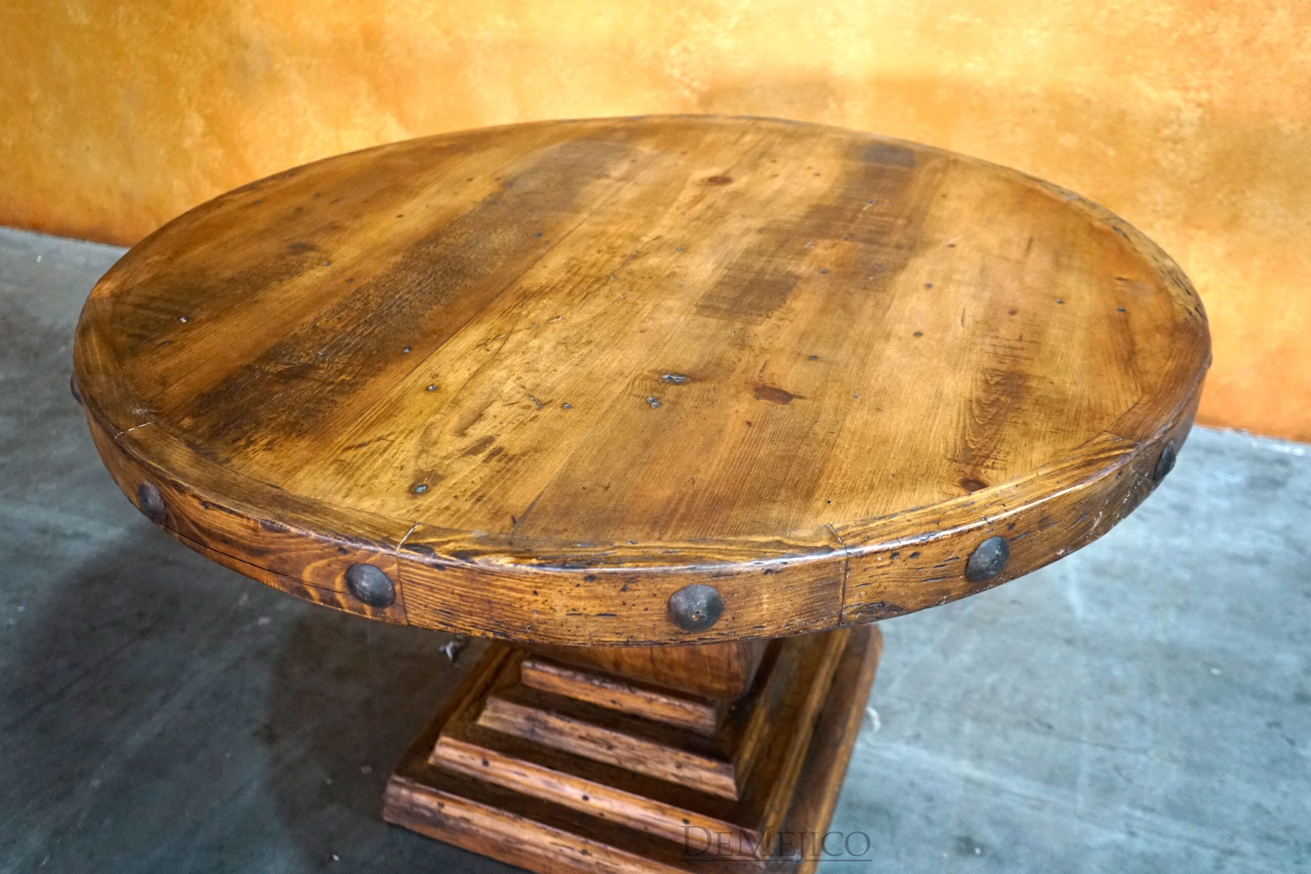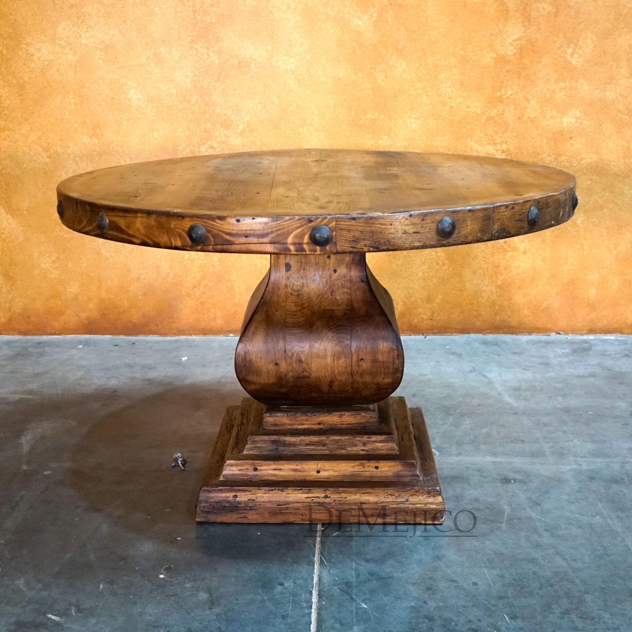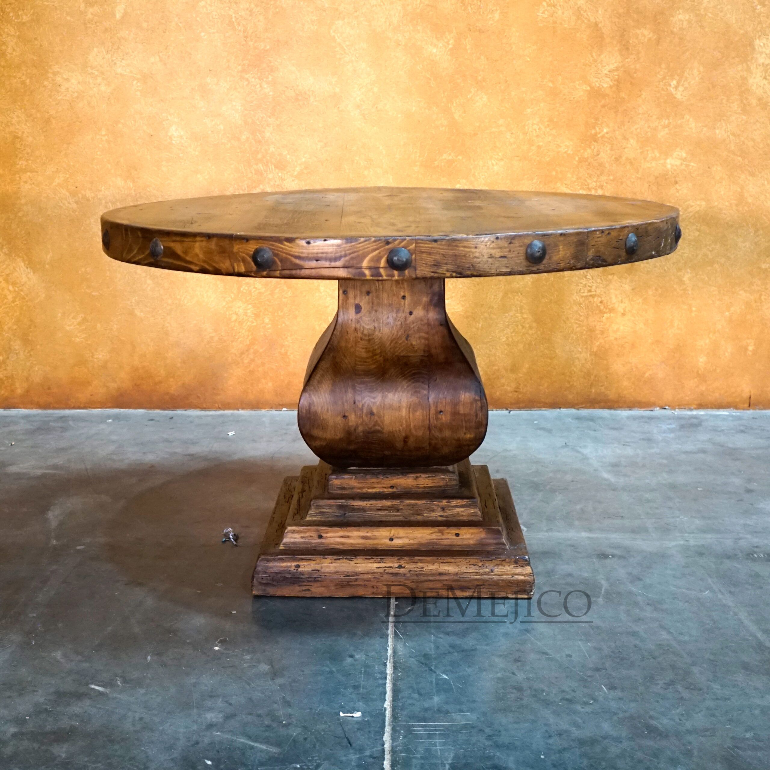 The Small Gitana Redonda Table is a freshly designed, round dining table made from old wood. Like many of our other round top tables, this one also features the old wood laid in planks, enhancing the natural knots, stretches and movements. Accenting this top, we have added large, hand pounded iron clavos along the table’s edge, giving it just a touch of Spanish feel. Blending both modern and Spanish design, the base of this rustic round table features wood that has been shaped in a version of our classic “Gitana” style design. Add the Gitana Redonda old wood round dining table to any dining or entertainment space for a piece that brings in both modern and Spanish elements.