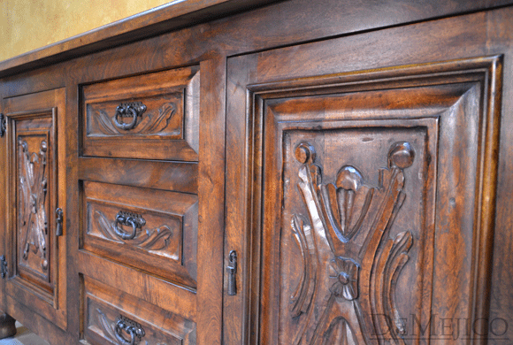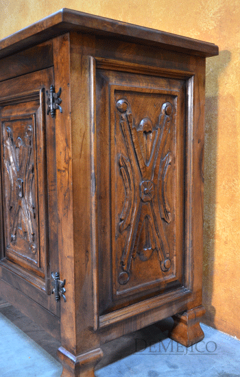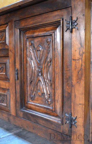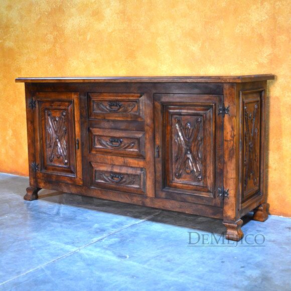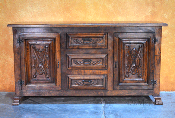 The Small Luis Quince Buffet is a beautiful Spanish Colonial Buffet made from solid mesquite wood. Two cabinets and three center drawers featuring hand carved Spanish Colonial designs are the main focal points of this piece. Surrounding these designs, are raised panels and forged iron hardware, adding to that classic Spanish look. Finished with raised legs and a stain to enhance the wood and features, this piece is set to impress. Add the Small Luis Quince Buffet to the already Spanish style of your home, or, just give your dining or restaurant space a touch of Spanish flair.