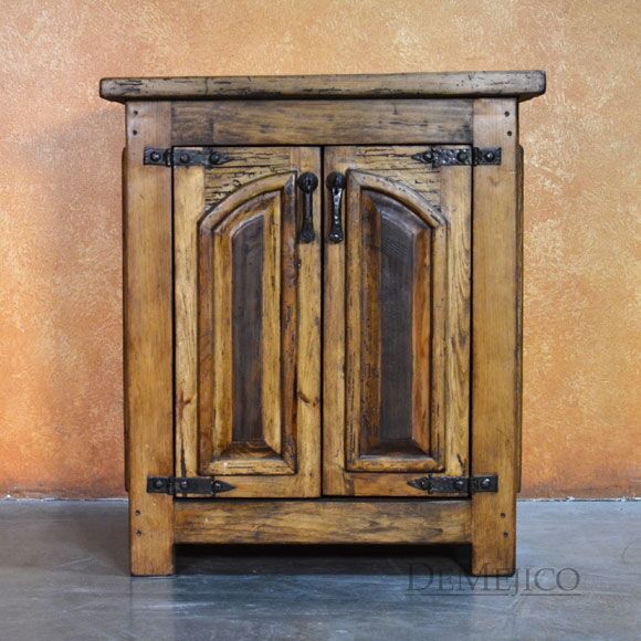 The Small Santos Nightstand is a brand new addition to our Bedroom Catalog. Carefully crafted from old wood, this Spanish nightstand features naturally imperfect surfaces that showcase its natural stretches and knots. Catching your eye, the double door cabinets on this nightstand feature two raised panels with subtle Spanish arches. Accented by hand forged iron pulls and hardware, these doors open up to a great deal of storage space for all of your bedside needs. Finished off with raised paneling on the sides, the Santos Nightstand is a perfect addition to any Spanish style bedroom space.