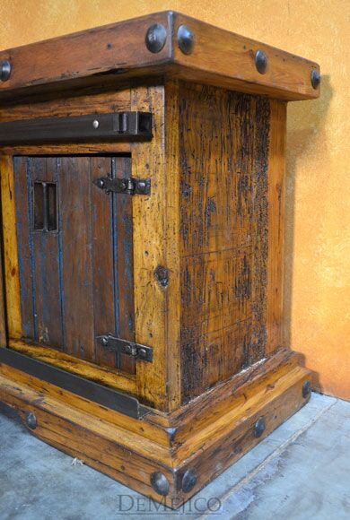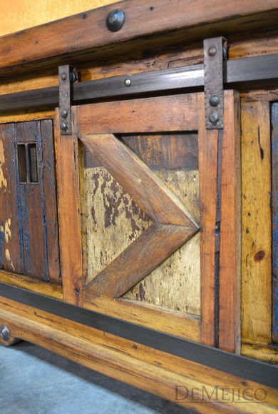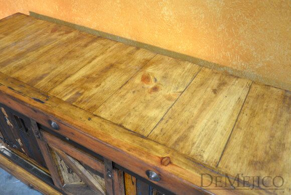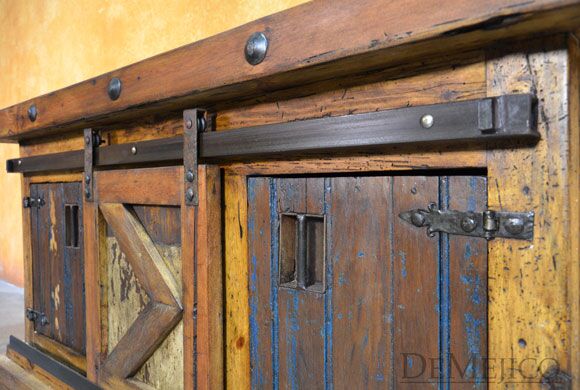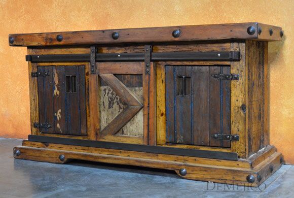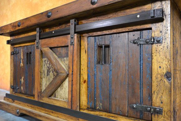 A unique addition to our Living Room Catalog, the Small Troje TV Stand is a classically styled rustic entertainment center with farmhouse style influences. Made from solid old wood, this small entertainment center features a smooth top laid in short planks. For storage and display, this entertainment center features something very unique to our authentic Spanish style. The Troje TV Stand features a single small barn door that slides from the center to the left and right. Behind this barn door is an additional shelf, for a hidden (or non-hidden) storage/display. Along with two more cabinets, made from original old doors, this farmhouse entertainment center provides a great deal of storage space. Complete with hand forged iron hardware, the Small Troje TV Stand is sure to bring a rustic style to any style home.