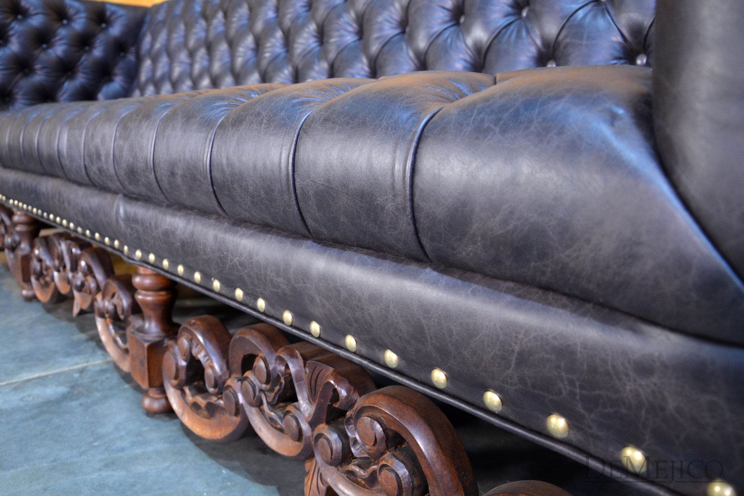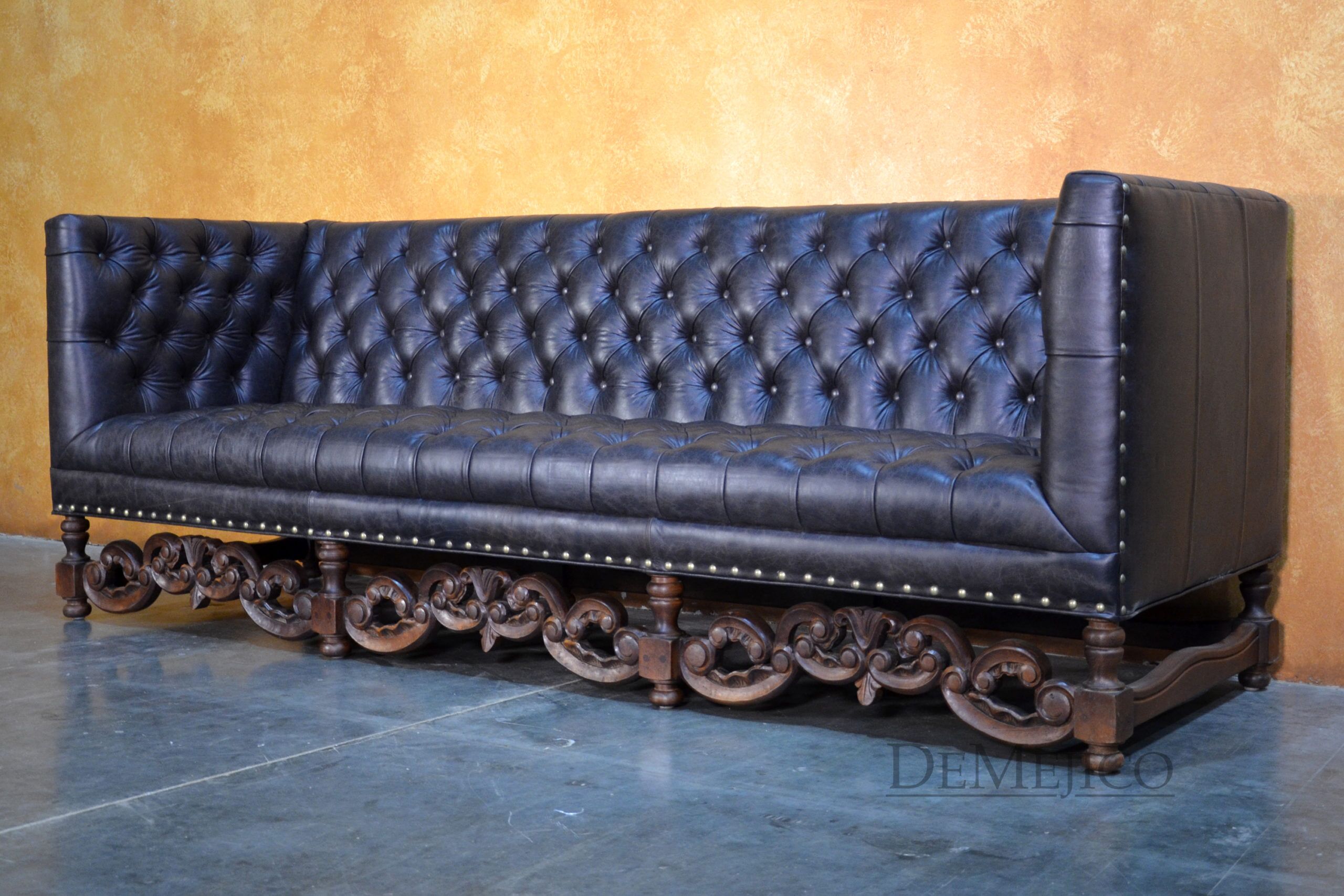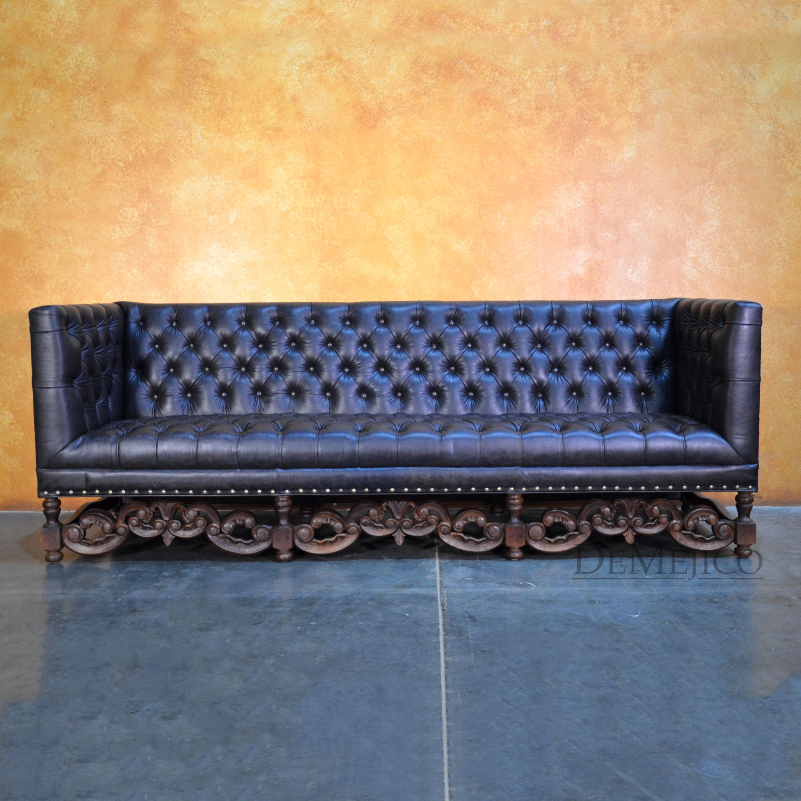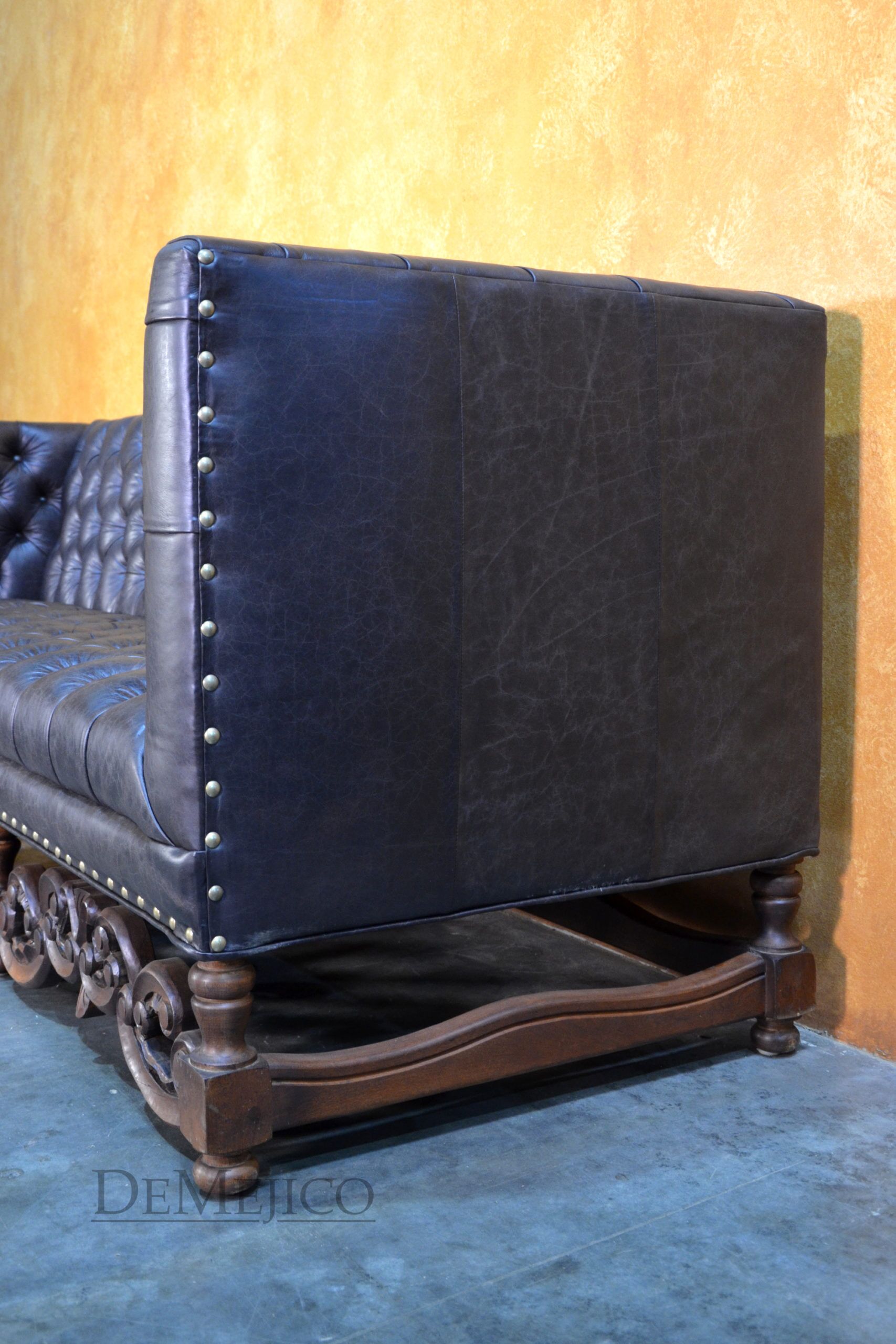 A brand new addition to our Living Room Catalog, the Sofa Alejandro is a beautiful Spanish leather sofa, sure to grab your attention. Upholstered with a classic tufted design, the seat and backrest paired with the raised arms, give this sofa a grand, bachelor style feel. But, we can’t just let this piece be “for the boys”… To give it a bit of a feminine touch, the base of this brown leather sofa features the most gorgeous hand carved detailing. Hand crafted from solid mesquite wood, these legs pick the sofa up off the ground, and give it that extra Spanish flair. Finishing off the Sofa Alejandro, the bottom of the leather is accented by hand pounded studs. Both comfortable and stylish, this Spanish tufted sofa can be the perfect touch to your bachelor pad, office, or entertainment space. Ask us about how we can customize one for you!