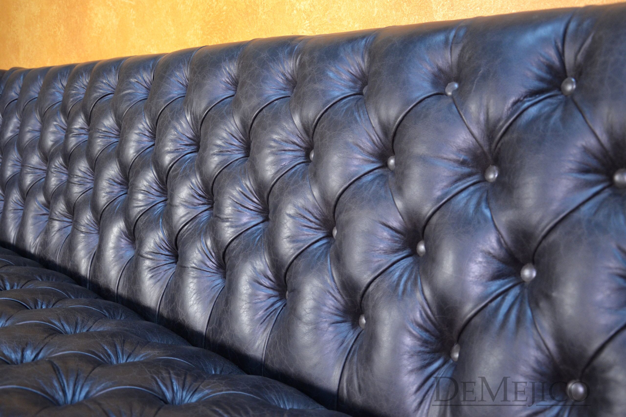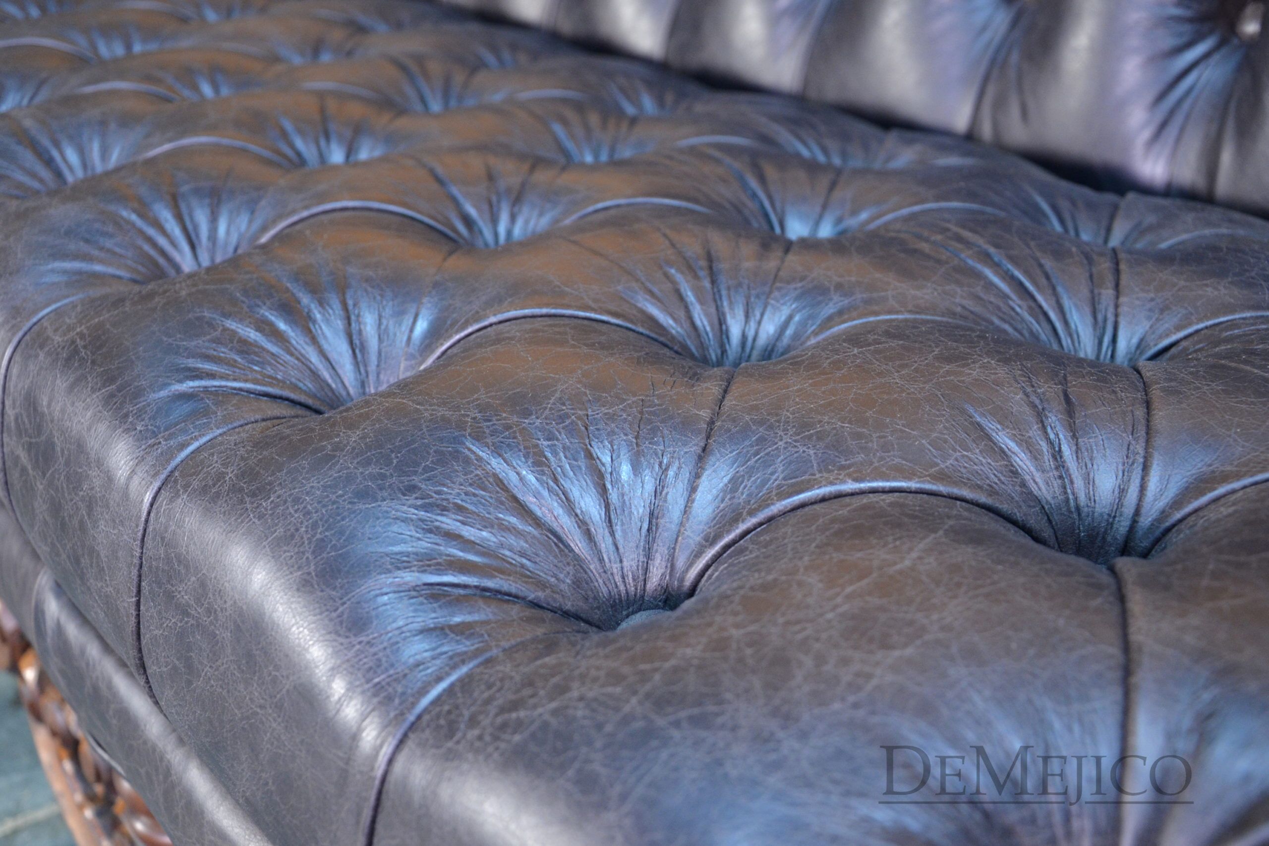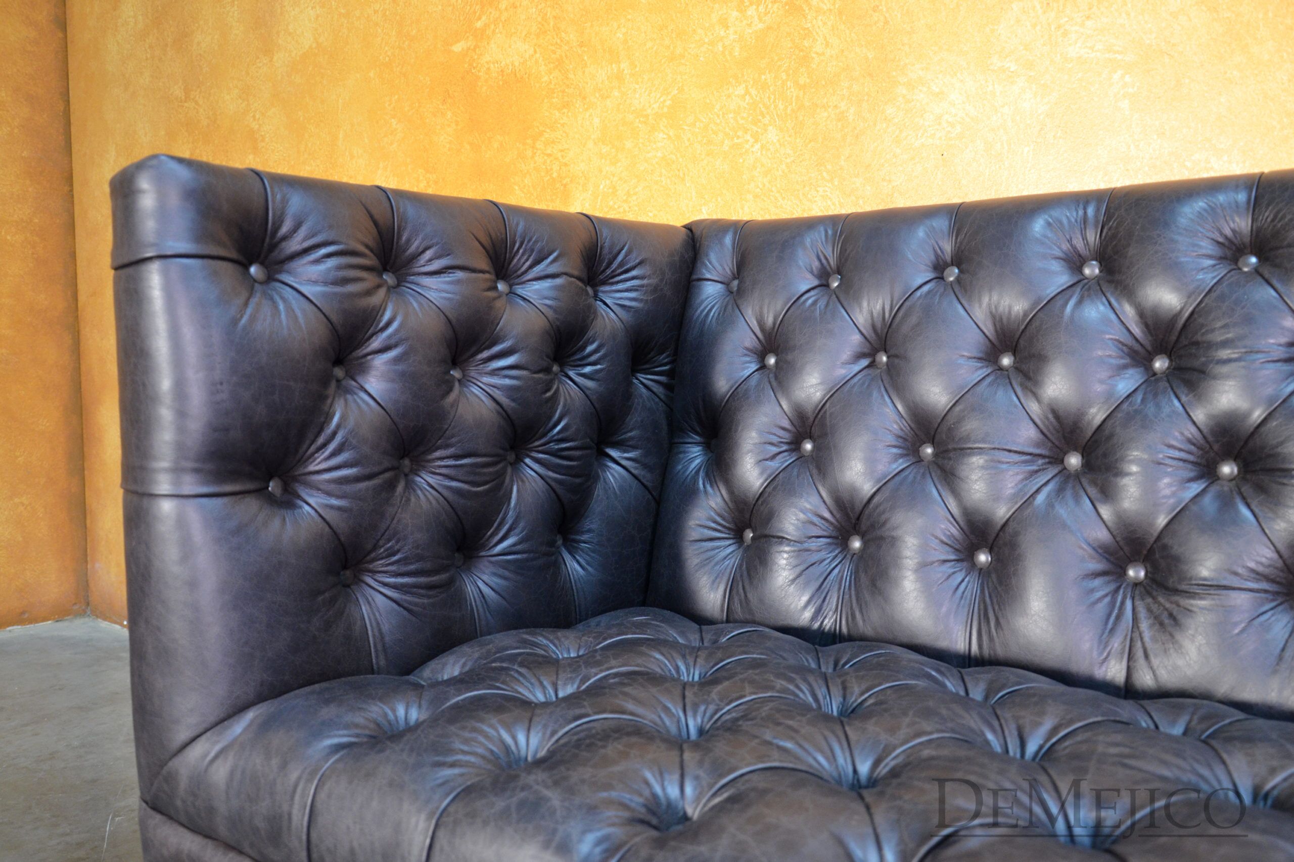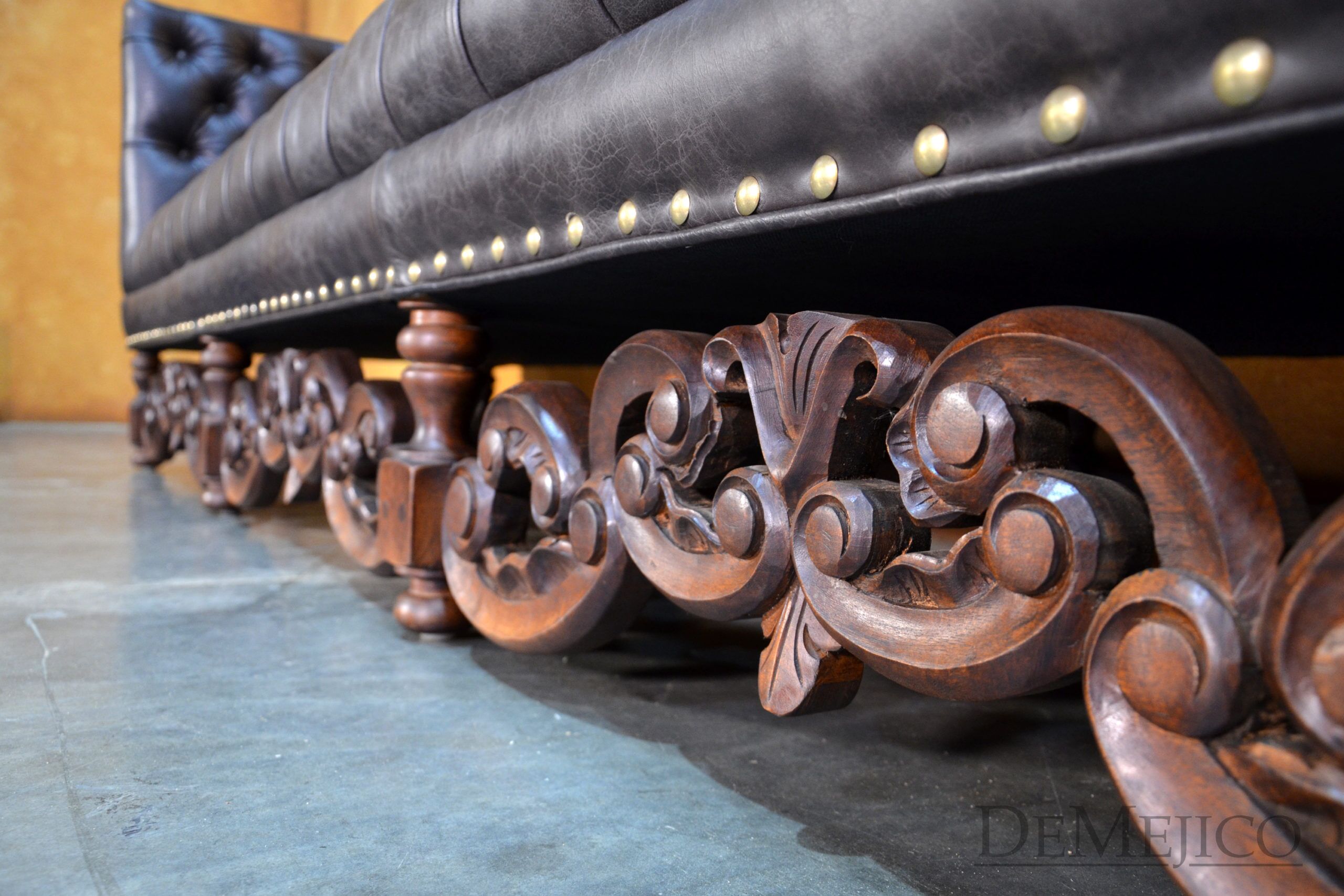 A brand new addition to our Living Room Catalog, the Sofa Alejandro is a beautiful Spanish leather sofa, sure to grab your attention. Upholstered with a classic tufted design, the seat and backrest paired with the raised arms, give this sofa a grand, bachelor style feel. But, we can’t just let this piece be “for the boys”… To give it a bit of a feminine touch, the base of this brown leather sofa features the most gorgeous hand carved detailing. Hand crafted from solid mesquite wood, these legs pick the sofa up off the ground, and give it that extra Spanish flair. Finishing off the Sofa Alejandro, the bottom of the leather is accented by hand pounded studs. Both comfortable and stylish, this Spanish tufted sofa can be the perfect touch to your bachelor pad, office, or entertainment space. Ask us about how we can customize one for you!