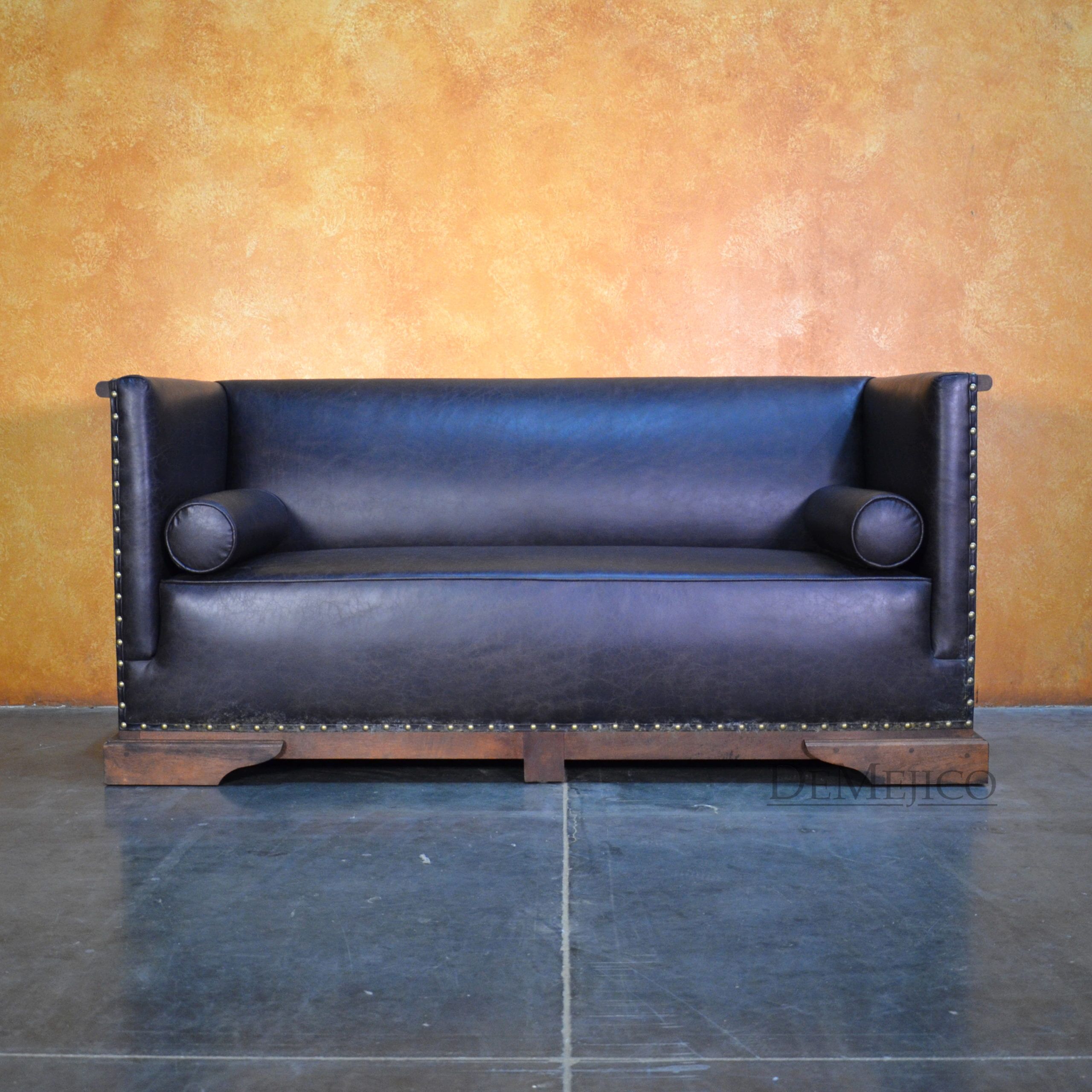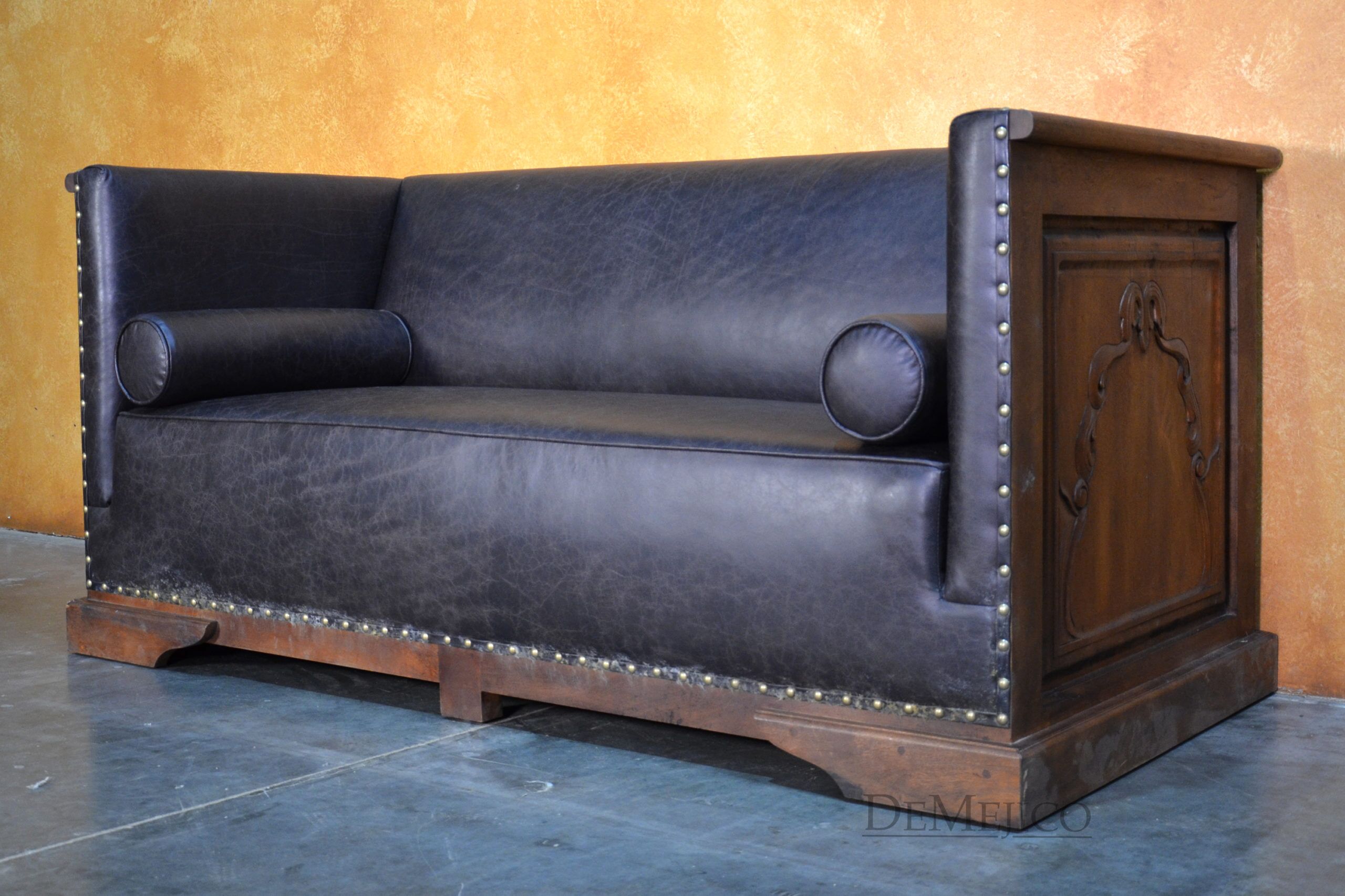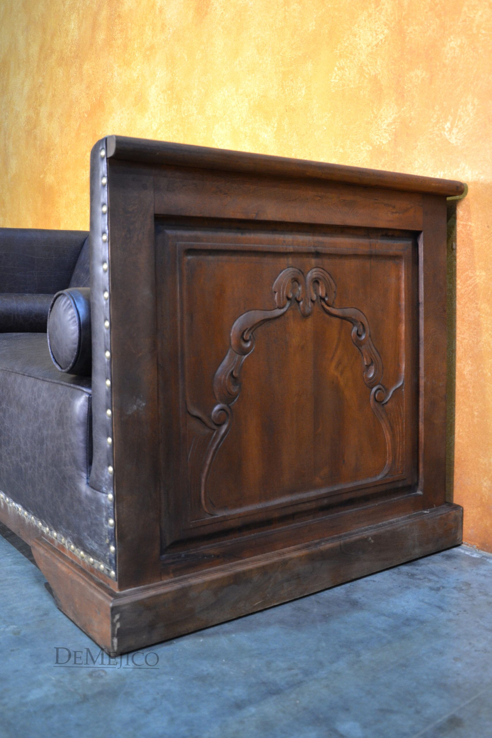 A brand new addition to our Living Room Catalog, the Sofa Bianca is a beautiful Spanish leather sofa, sure to grab your attention. Upholstered with a smooth leather, the seat and backrest paired with the raised arms, give this sofa a grand and bold feel. To give it a bit of a feminine and softer touch, the sides and backside of this brown leather sofa feature simple, yet gorgeous raised panels, each with hand carved detailing. Hand crafted from solid mesquite wood, this frame picks the sofa up off the ground, and gives it that extra Spanish flair. Finishing off the Sofa Bianca, the bottom and arms of the leather are accented by hand pounded studs. Both comfortable and stylish, with matching rounded pillows, this Spanish sofa can be the perfect touch to your office or entertainment space. Ask us about how we can customize one for you!