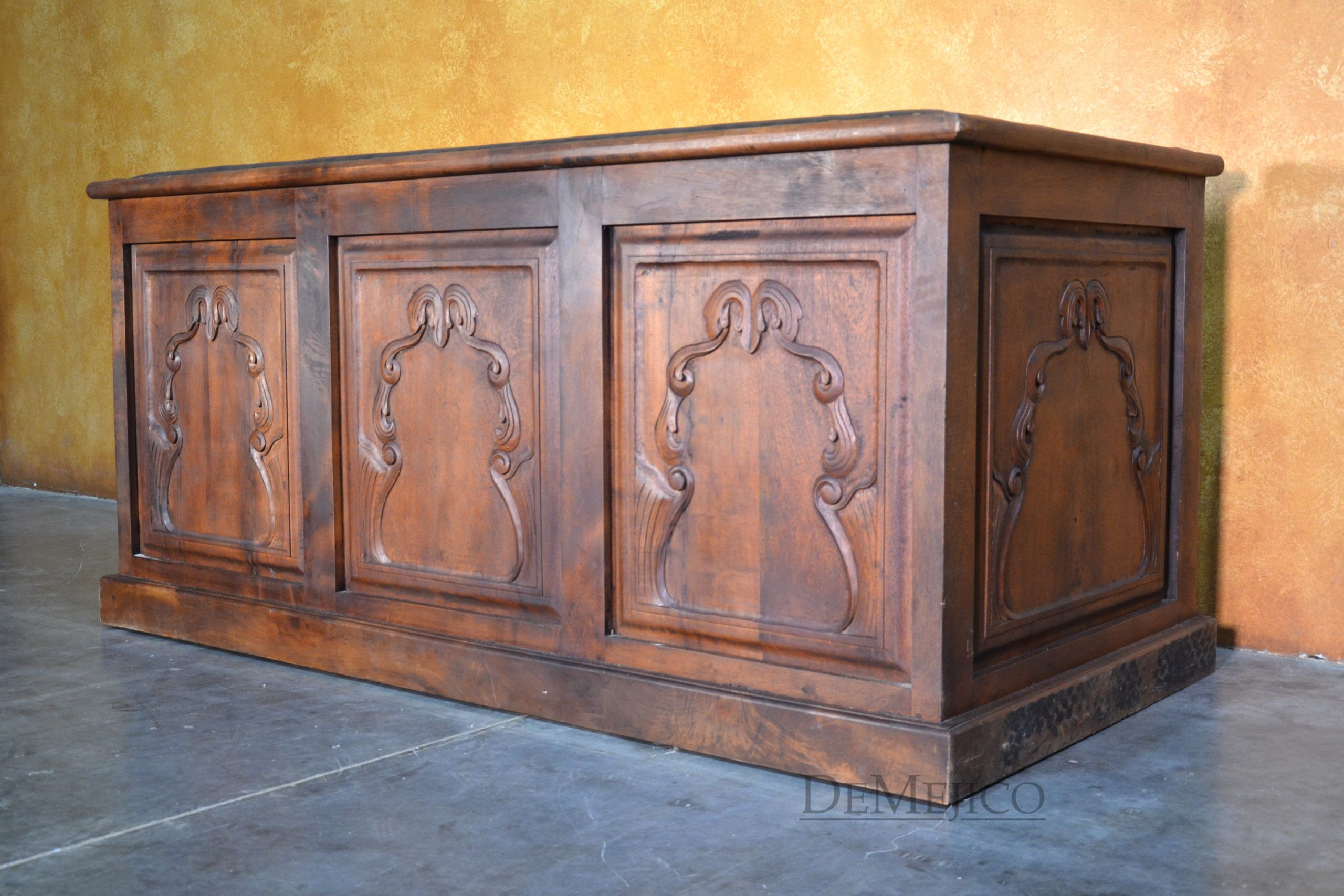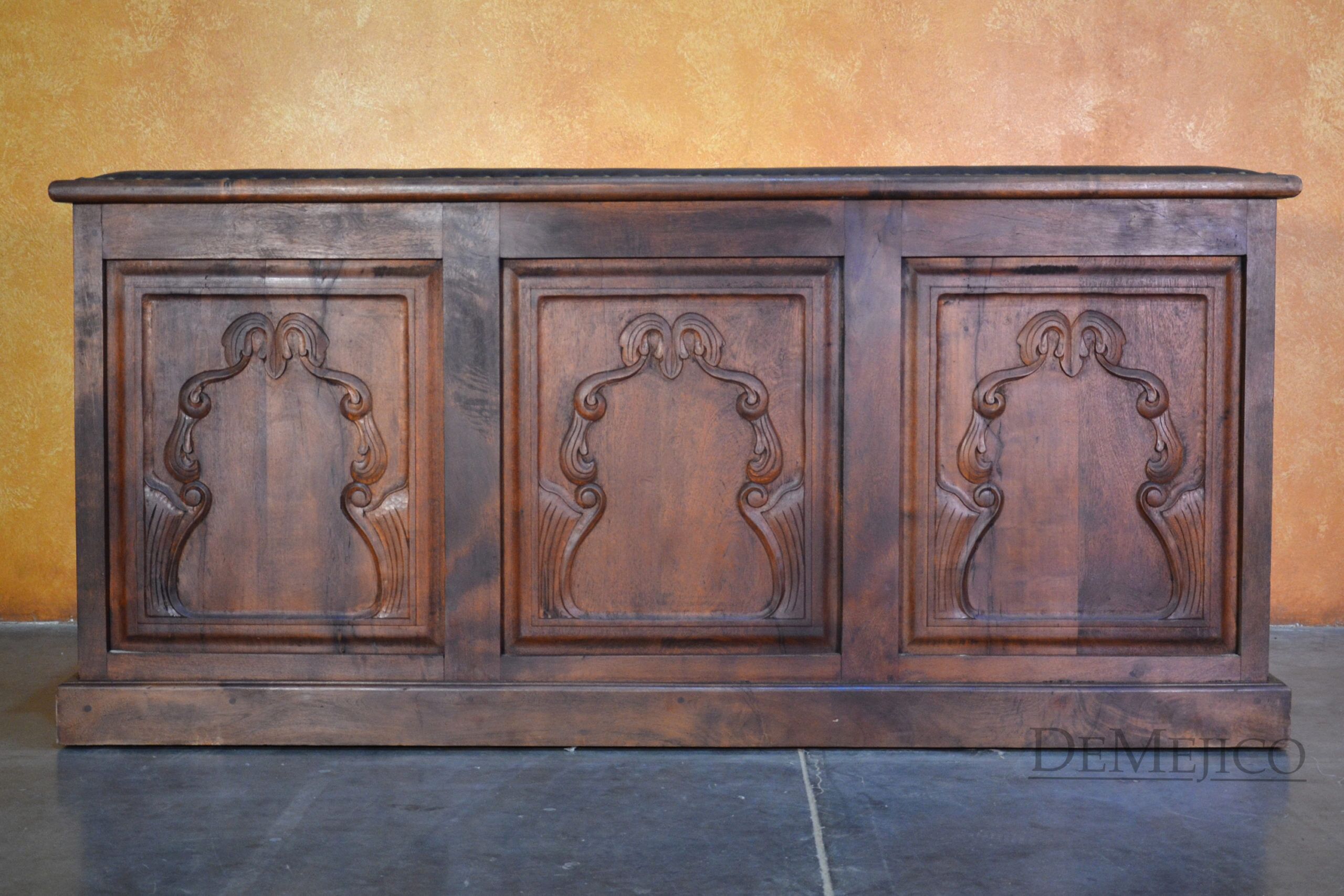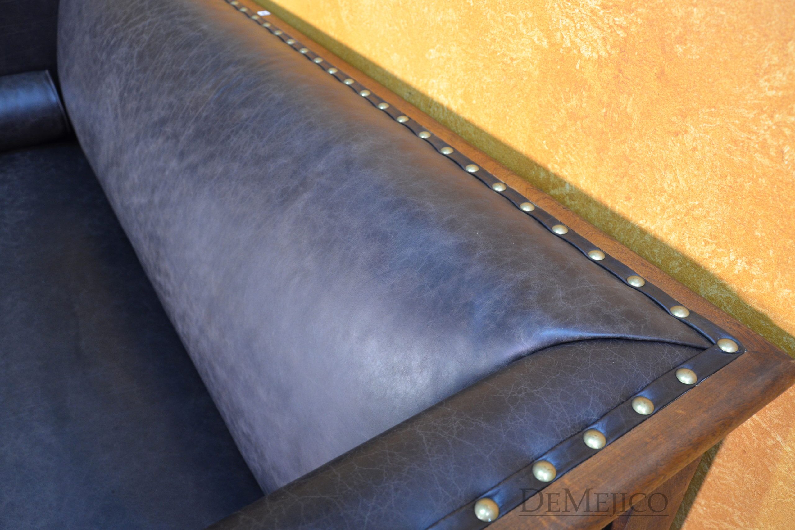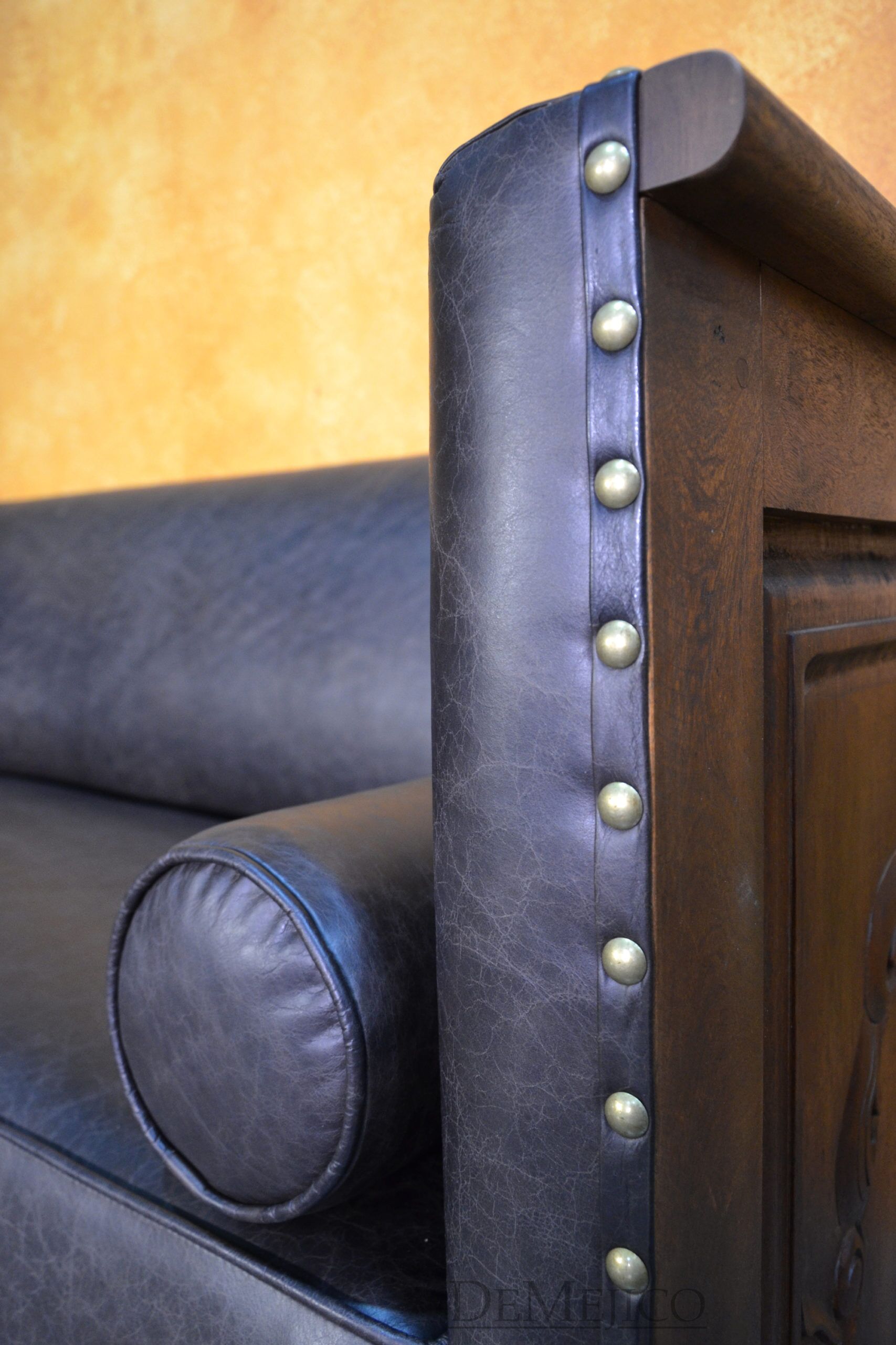 A brand new addition to our Living Room Catalog, the Sofa Bianca is a beautiful Spanish leather sofa, sure to grab your attention. Upholstered with a smooth leather, the seat and backrest paired with the raised arms, give this sofa a grand and bold feel. To give it a bit of a feminine and softer touch, the sides and backside of this brown leather sofa feature simple, yet gorgeous raised panels, each with hand carved detailing. Hand crafted from solid mesquite wood, this frame picks the sofa up off the ground, and gives it that extra Spanish flair. Finishing off the Sofa Bianca, the bottom and arms of the leather are accented by hand pounded studs. Both comfortable and stylish, with matching rounded pillows, this Spanish sofa can be the perfect touch to your office or entertainment space. Ask us about how we can customize one for you!