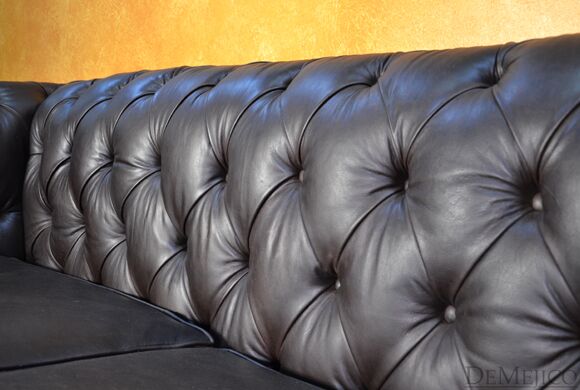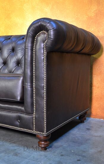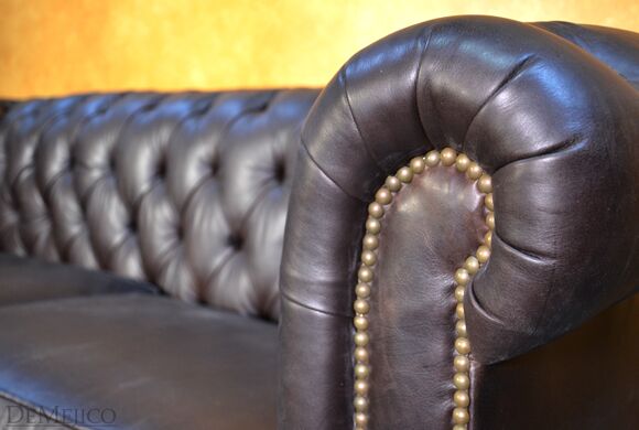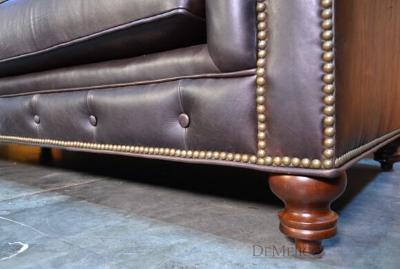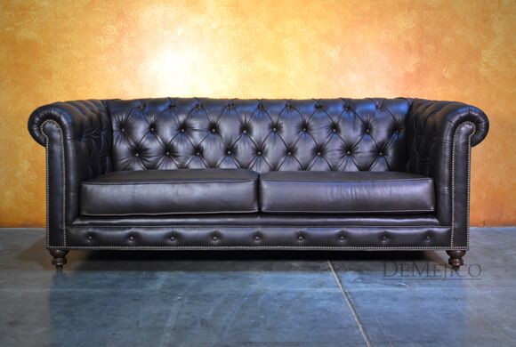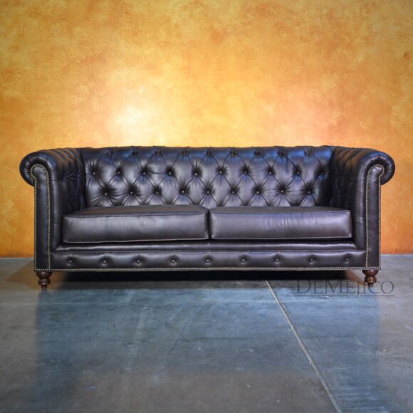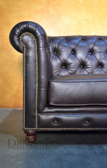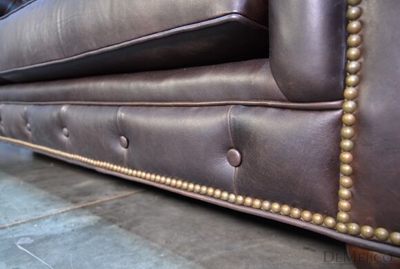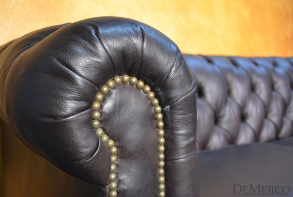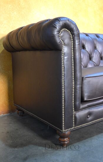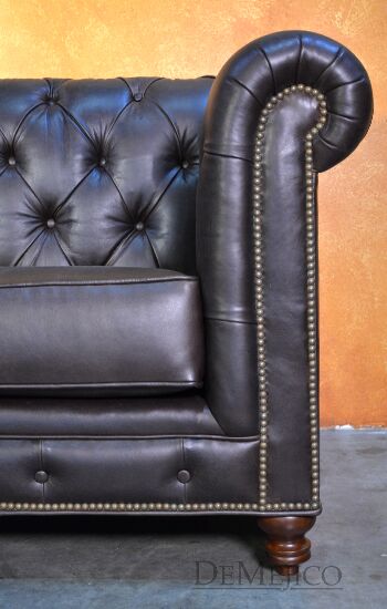 Looking for a Chesterfield Sofa? Want one with a Spanish touch? Featured in our Living Room Catalog, the Sofa Elegante Cafe is a beautiful Spanish style sofa. Upholstered with a smooth brown leather, the seat of this sofa is smooth while the backrest features a classic, tufted design. Accented by hand pounded studs, this brown leather sofa is both comfortable and stylish. Finishing off the Sofa Elegante Cafe are four, small rounded legs made from solid mesquite wood.