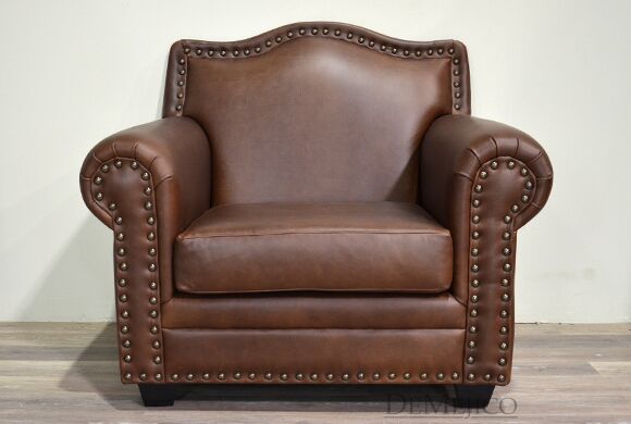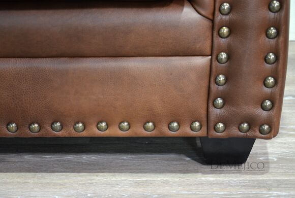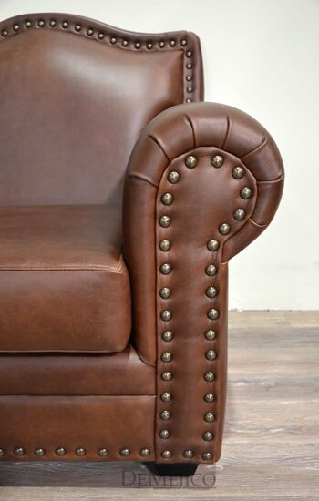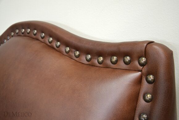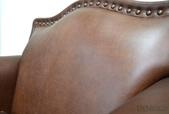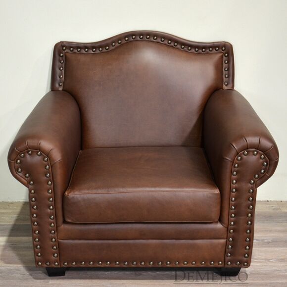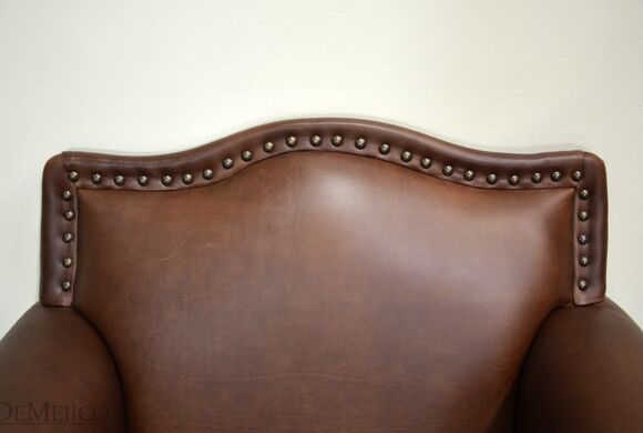 Featured in our Living Room Catalog, the Sofa Tabacon Spanish Armchair is a beautiful Spanish armchair. Upholstered with a smooth vintage leather, and accented by hand pounded iron clavos, this armchair is both comfortable and stylish. Finishing off the Sofa Tabacon Armchair are four, small rounded legs made from solid mesquite wood.