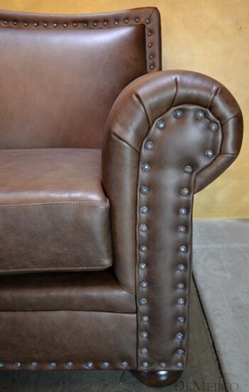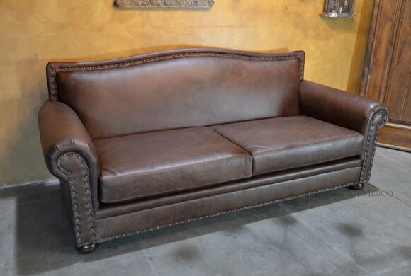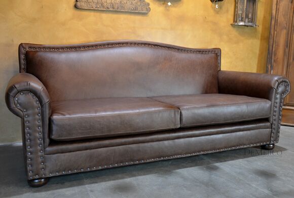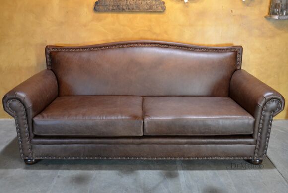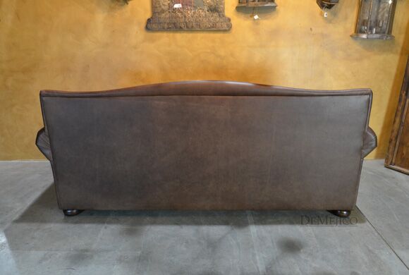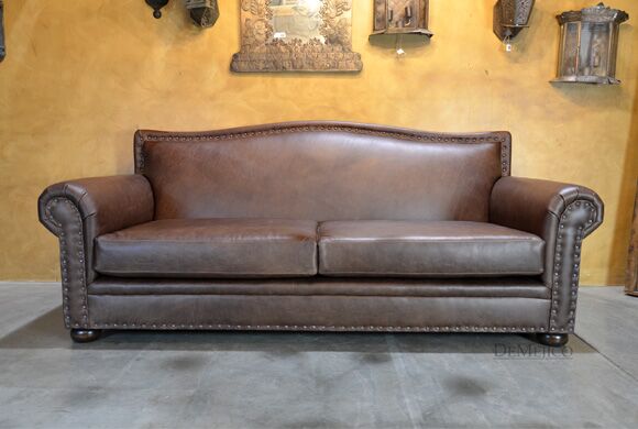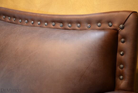 Featured in our Living Room Catalog, the Sofa Tabacon is a beautiful Spanish style sofa. Upholstered with a smooth vintage leather, and accented by hand pounded iron clavos, this sofa is both comfortable and stylish. Finishing off the Sofa Tabacon sofa are four, small rounded legs made from solid mesquite wood.