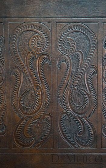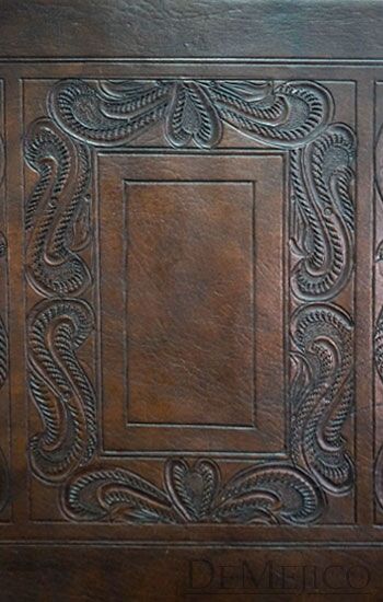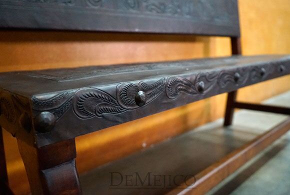 Featured in our Living Room Catalog, our Tooled Spanish Bench is newly designed, with eye-catching elements. Hand crafted from solid mesquite wood, the legs and base of this bench feature subtle Spanish curves. Grabbing your attention, the seat and backrest of this hand carved bench show off beautiful hand tooled leather detailing, surrounded by hand pounded clavos. With inspiration from Spanish Colonial Chairs, these benches are perfect for Spanish style spaces, whether they be your living room, covered outdoor patio, or even restaurant waiting area.