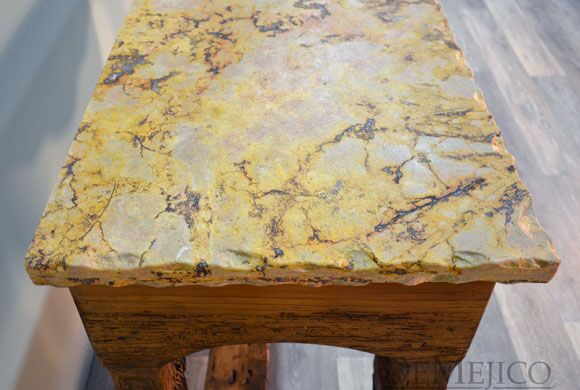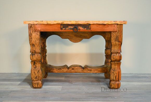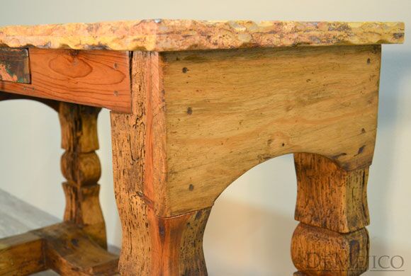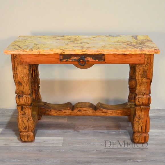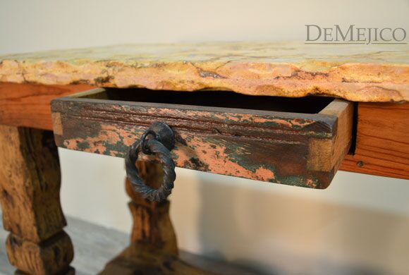 The Travertine Colonial Desk is a beautiful desk made from solid old wood. Grabbing your attention, this desk features a beautiful travertine stone top, paired with natural knots, stretches and imperfections in the wood. Taking inspiration from our classic Colonial style designs and our Escritorio Colonial, this desk features thick legs, with hand turned and carved designs, along with hand carved arched details on the front and trestle base. With a flat edge that sits flush to the wall, this old wood Colonial desk embodies classic Spanish style. The opposite side features a single drawer with a hand forged, wrought iron drawer pull.