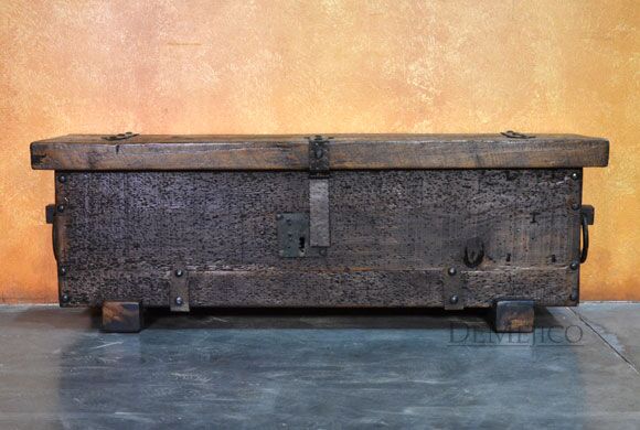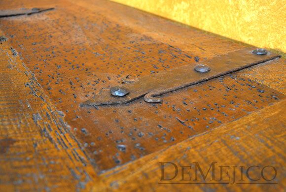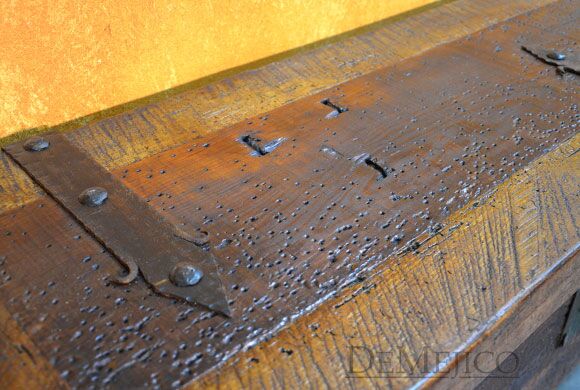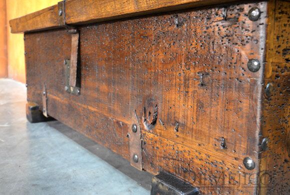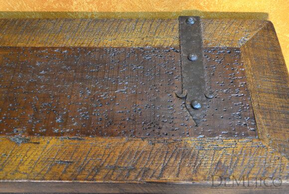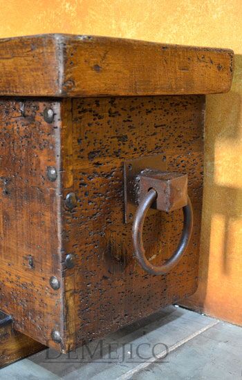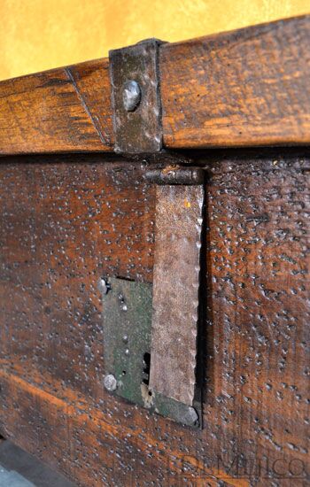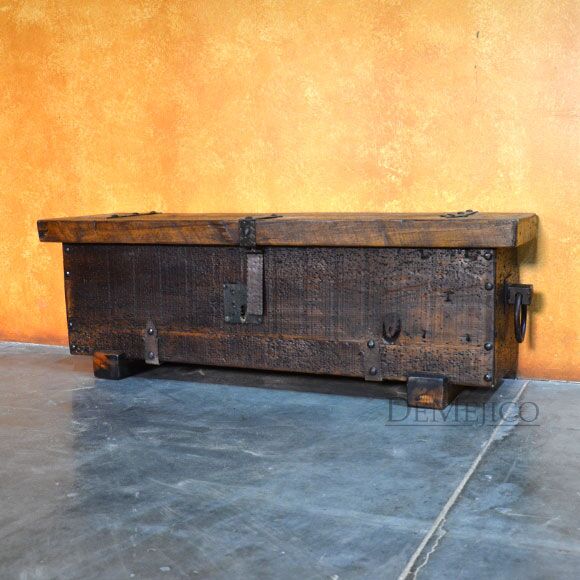 Mixing Old World and Colonial style design, the Troje Trunk Bench is a new and unique piece, featured in our Living Room Catalog. Made from reclaimed wood, this storage bench showcases natural knots, stretches, and imperfections, giving off a classic, rustic look. Bringing out the Old World style, this old wood bench is adorned with hand forged iron accents from clavos to straps to a fully functional latch with keyhole and key! Perfectly functioning as a rustic bench, storage bench or even a footboard bench, the Troje Trunk Bench opens up to a great deal of storage space.