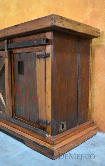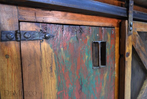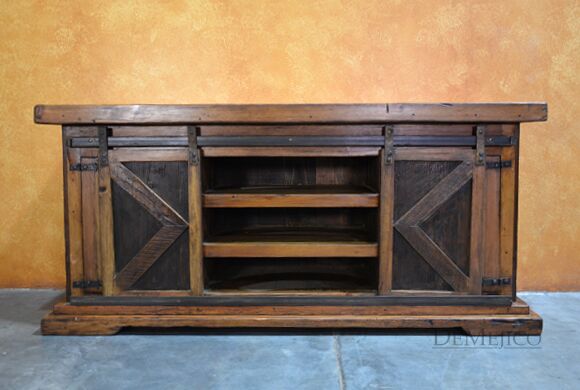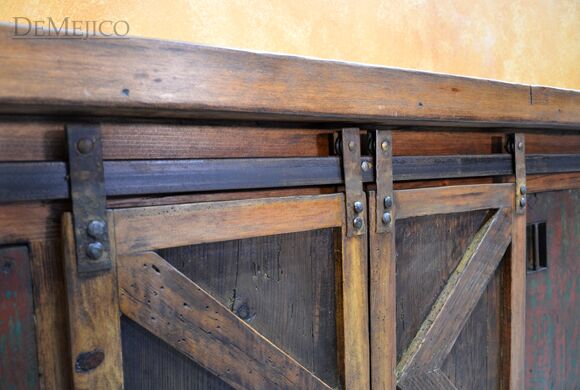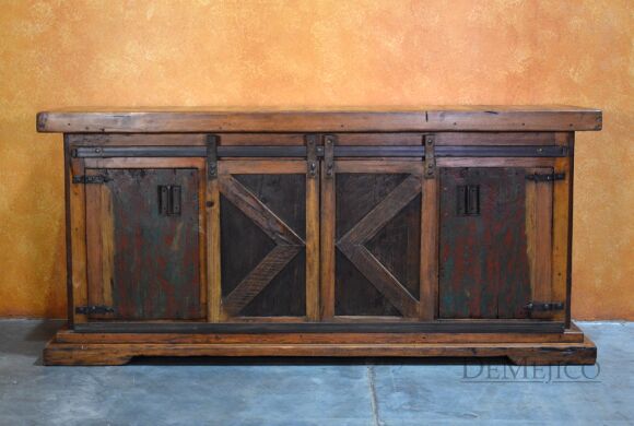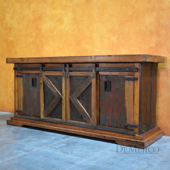 A unique addition to our Living Room Catalog, the 78″ Troje TV Stand is a classically styled rustic entertainment center with farmhouse style influences. Made from solid old wood, this entertainment center features a smooth top laid in short planks. For storage and display, this entertainment center features something very unique to our authentic Spanish style. The Troje TV Stand features small barn doors that slide from the center to the left and right. Behind these barn doors are two thick shelves, for a hidden (or non-hidden) storage/display. Along with two more cabinets, made from original old doors, this farmhouse entertainment center provides a great deal of storage space. Complete with hand forged iron hardware, the 78″ Troje TV Stand is sure to bring a rustic style to any style home.