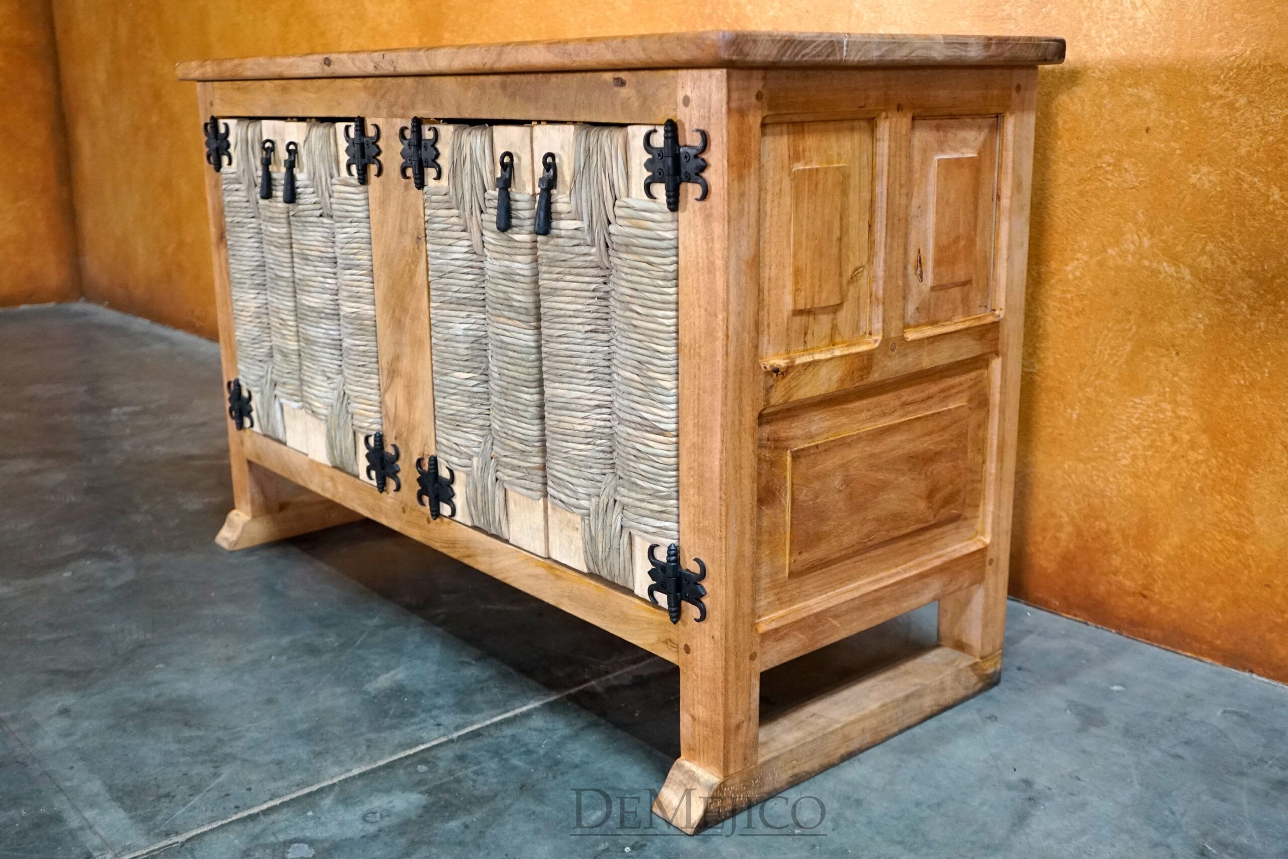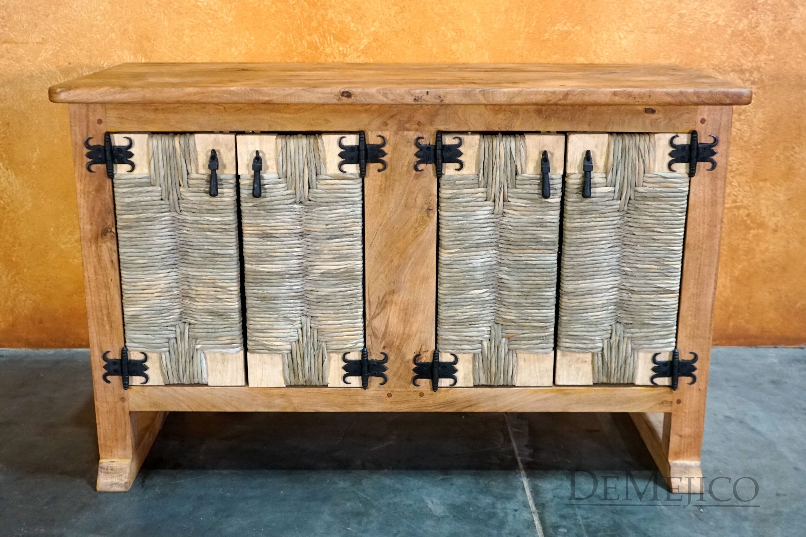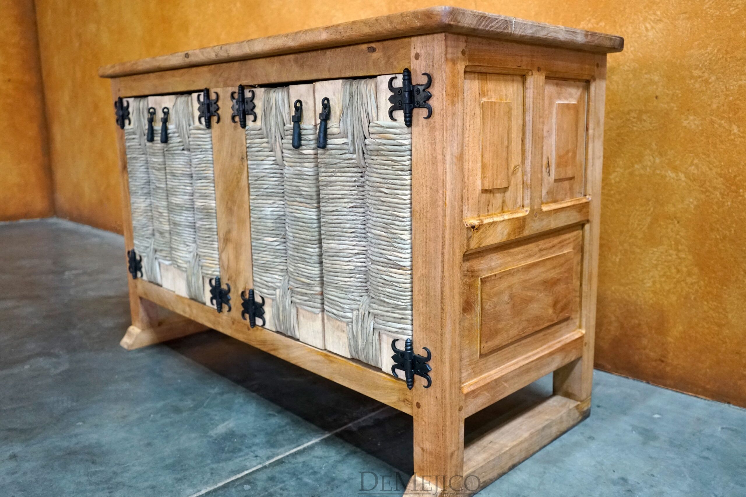 A brand new addition to our Living Room Catalog, the Tulum TV Stand is a beautiful piece, showing off a mixture of Coastal and Spanish style. Hand crafted from smooth rosa morada wood, these pieces are complete with a smooth finish to showcase the beautiful stretches of its grain. The double doors on the Tulum TV Stands feature the hand woven elements of Coastal furniture styles while the hardware is hand forged and deep side panels bring out a classic Spanish touch. Add this beachy tv stand to your beach home, coastal interior space or even your Spanish style living room for a unique natural furniture touch.