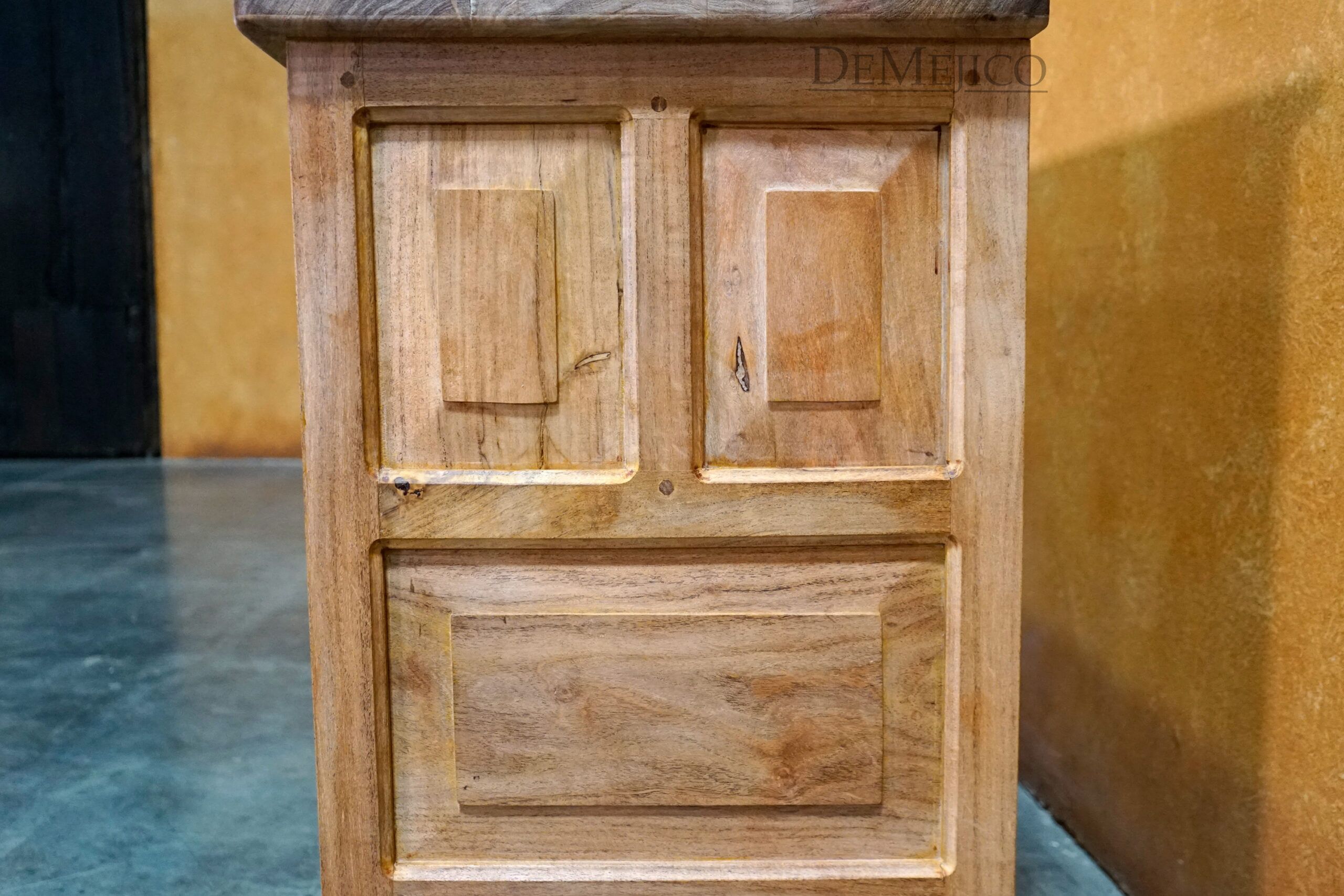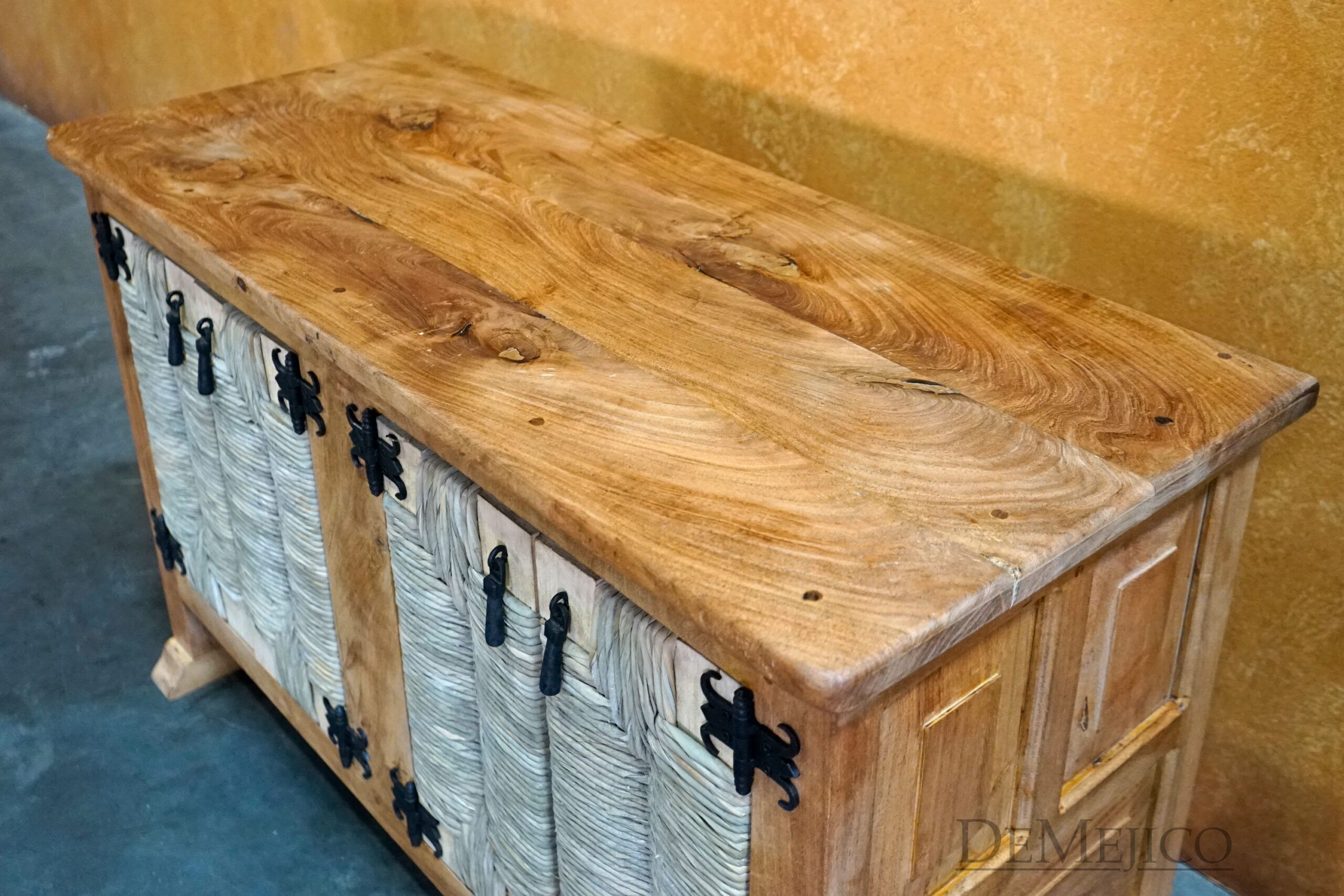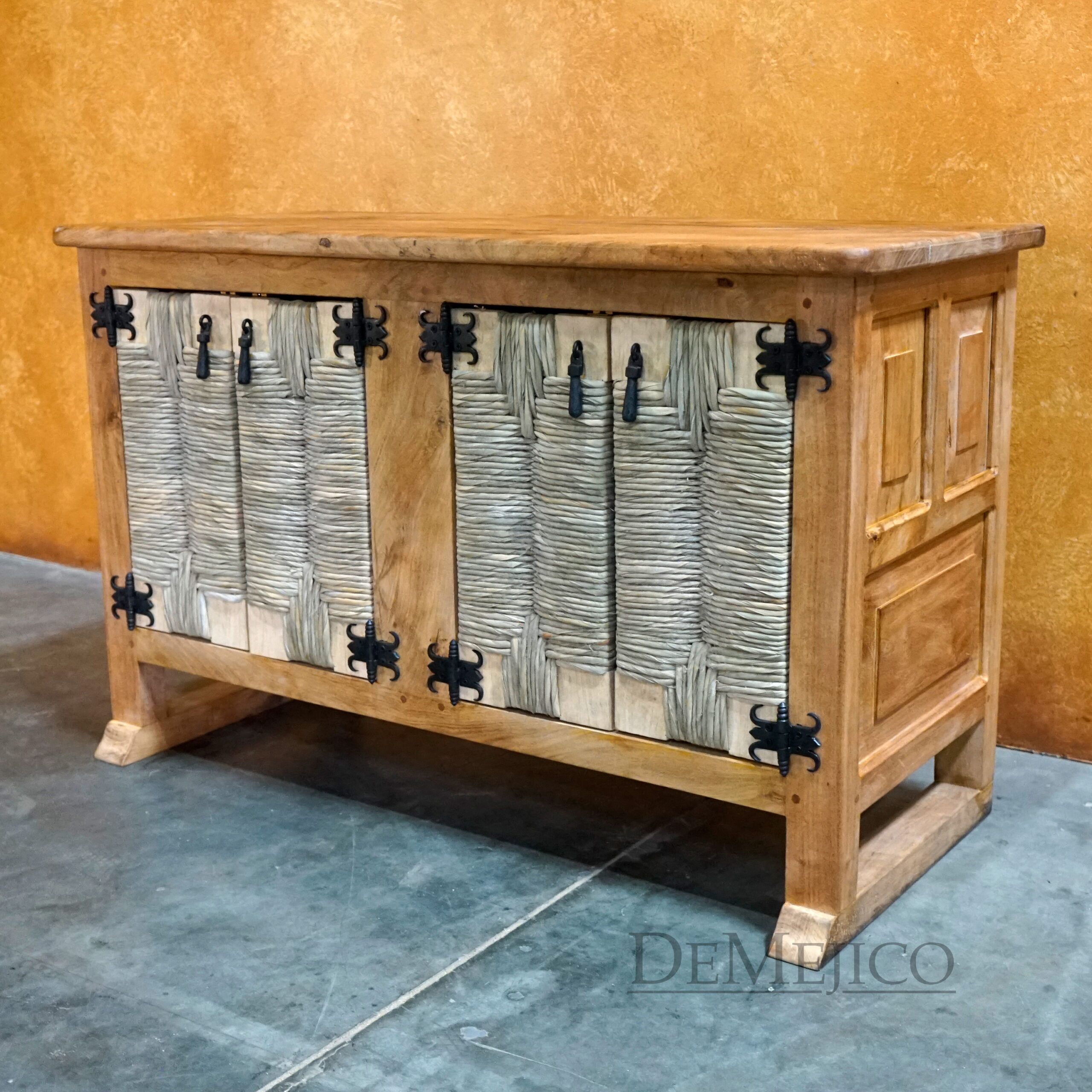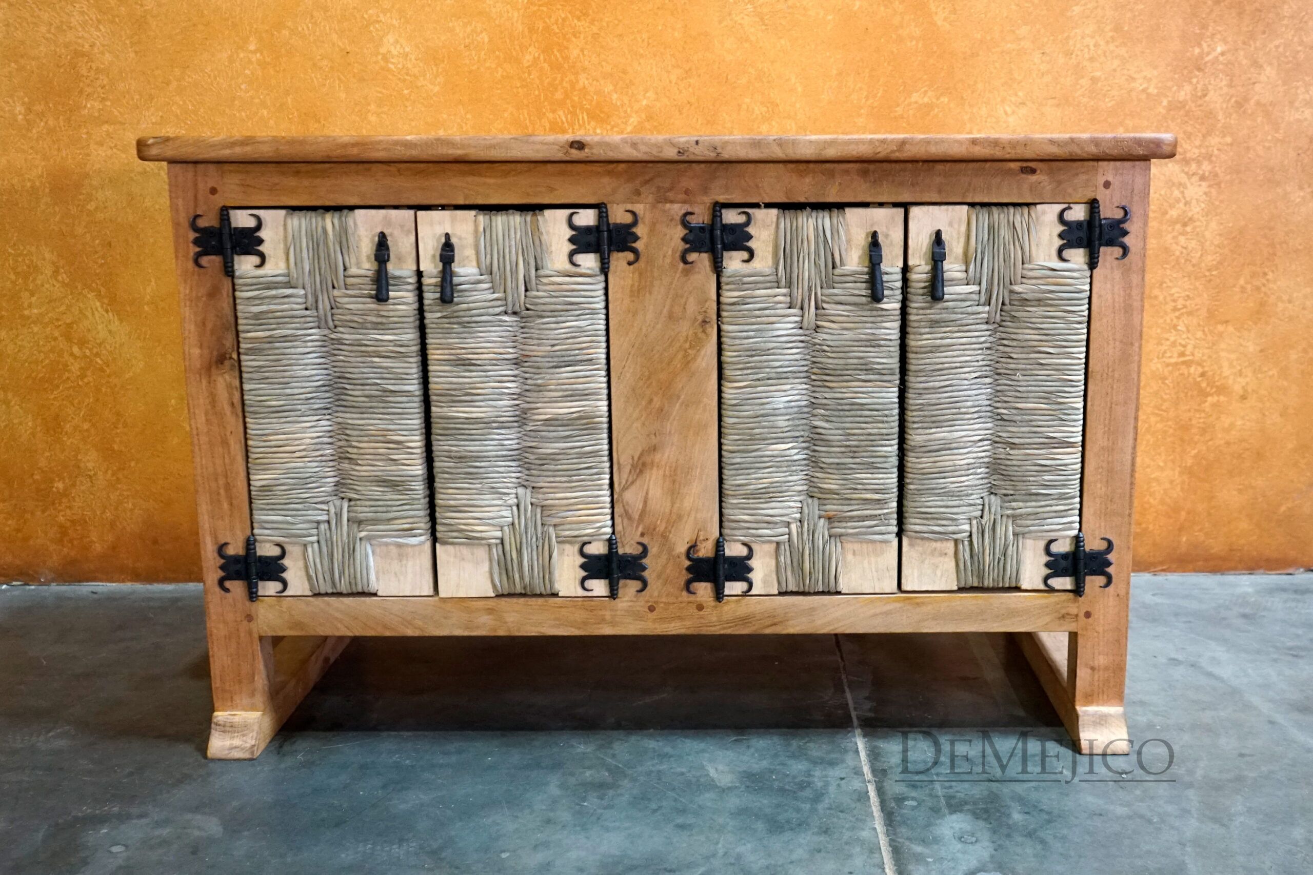 A brand new addition to our Living Room Catalog, the Tulum TV Stand is a beautiful piece, showing off a mixture of Coastal and Spanish style. Hand crafted from smooth rosa morada wood, these pieces are complete with a smooth finish to showcase the beautiful stretches of its grain. The double doors on the Tulum TV Stands feature the hand woven elements of Coastal furniture styles while the hardware is hand forged and deep side panels bring out a classic Spanish touch. Add this beachy tv stand to your beach home, coastal interior space or even your Spanish style living room for a unique natural furniture touch.