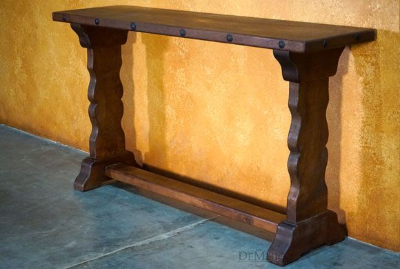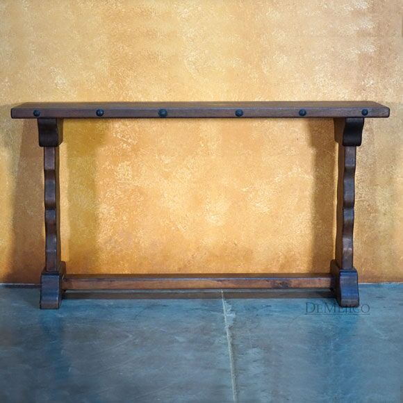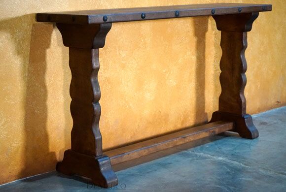 Freshly designed and added to our Living Room Catalog, the Valentina Sofa Console is a Spanish sofa console table made from solid mesquite wood. The wood’s natural knots, movements, and stretches are all beautifully showcased within the top and on the hand carved curved legs. Finishing off, hand pounded iron clavos accent the Valentina Sofa Console’s top edges.