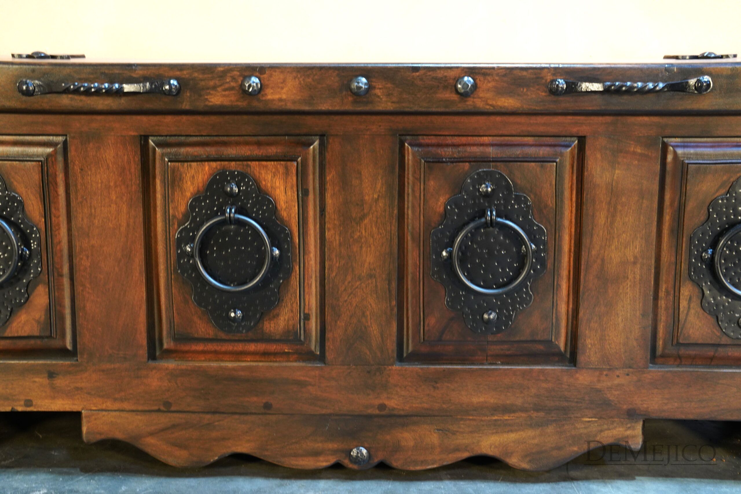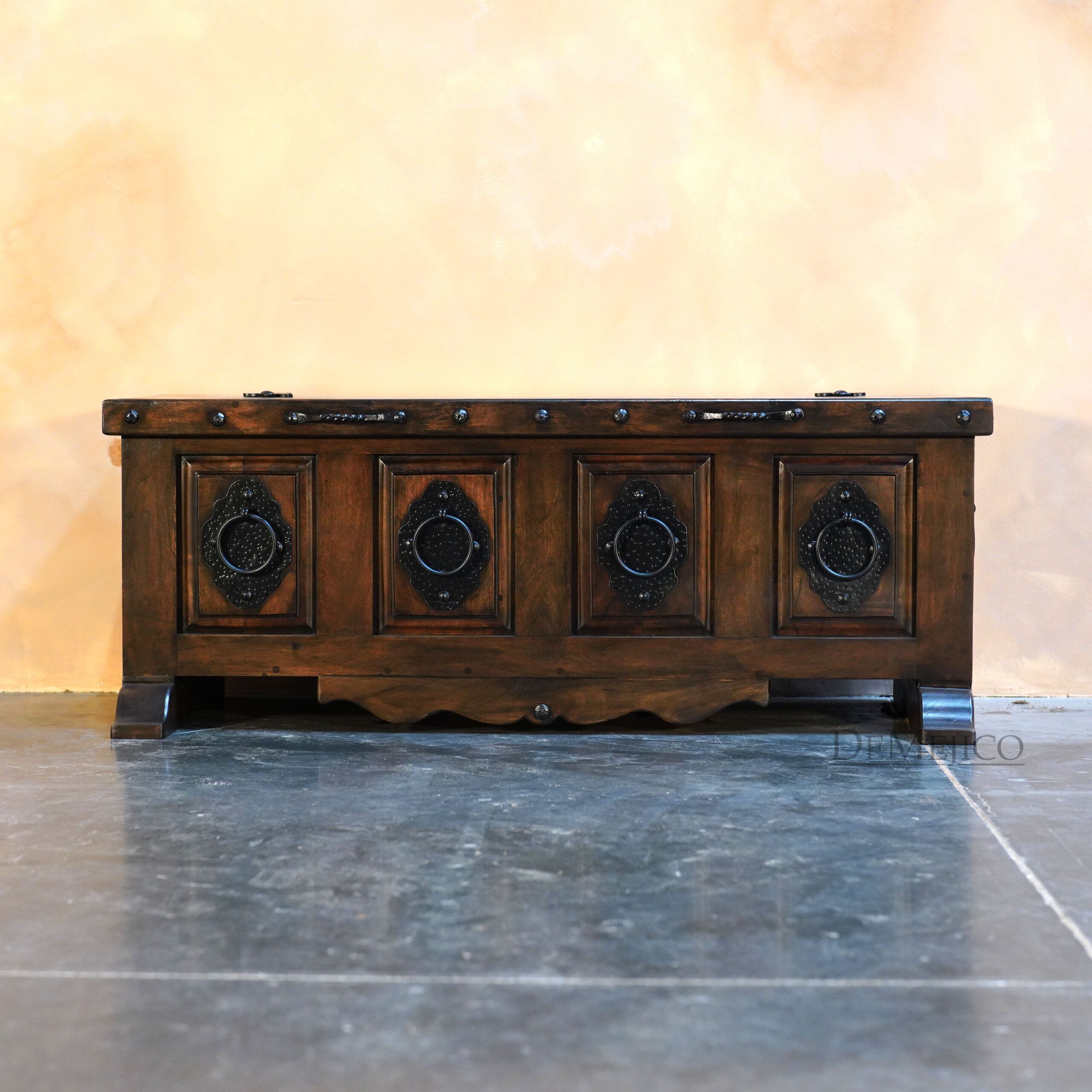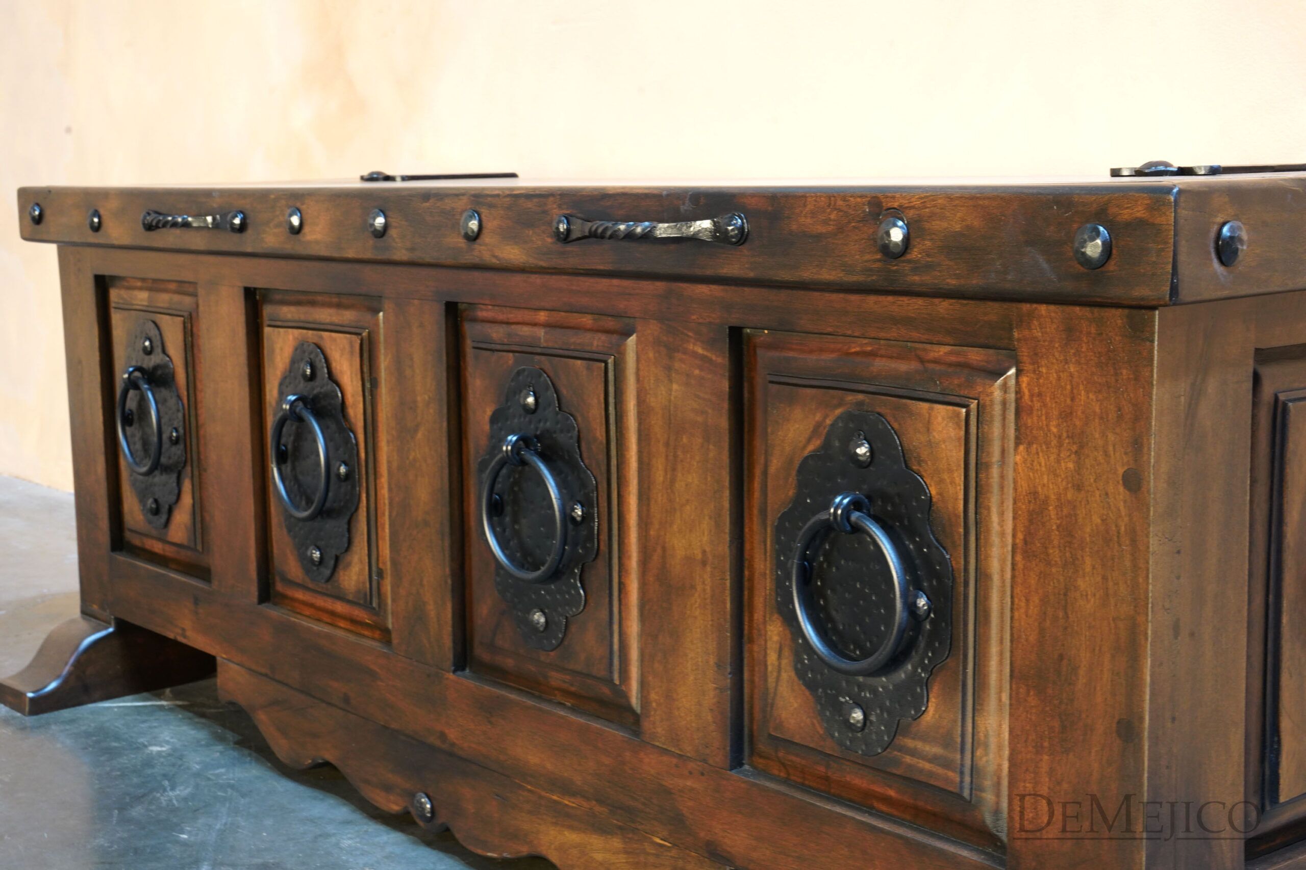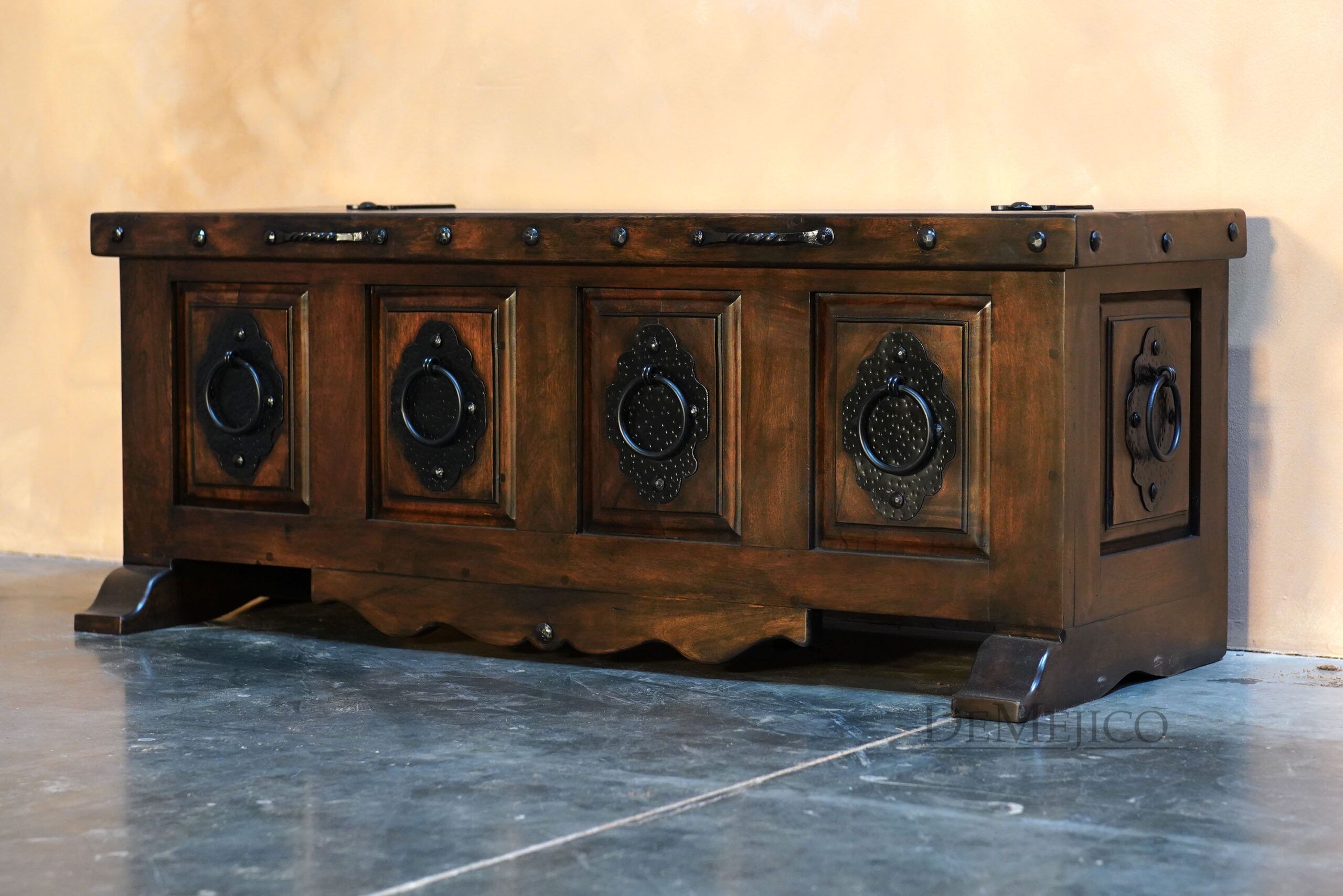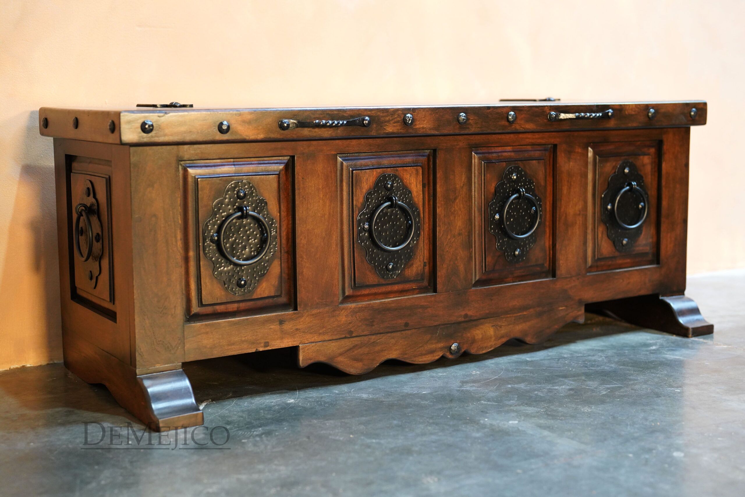 The Valentina Storage Bench is a new and freshly designed Spanish carved bench, featured in our Living Room Catalog. Inspired by our Valentina styles, this storage bench is hand crafted from solid mesquite wood finished in a beautiful stain, with raised panels that are accented by large hand forged accents. With subtly curved additions on the base and feet, the Valentina Storage Bench brings in a feminine touch. What could make this backless bench even better? Lift the seat for added storage space! Perfect as a foyer bench or a bedroom bench, the Valentina Storage Bench is an attention-grabbing piece fit for any space that needs a touch of Spanish style.