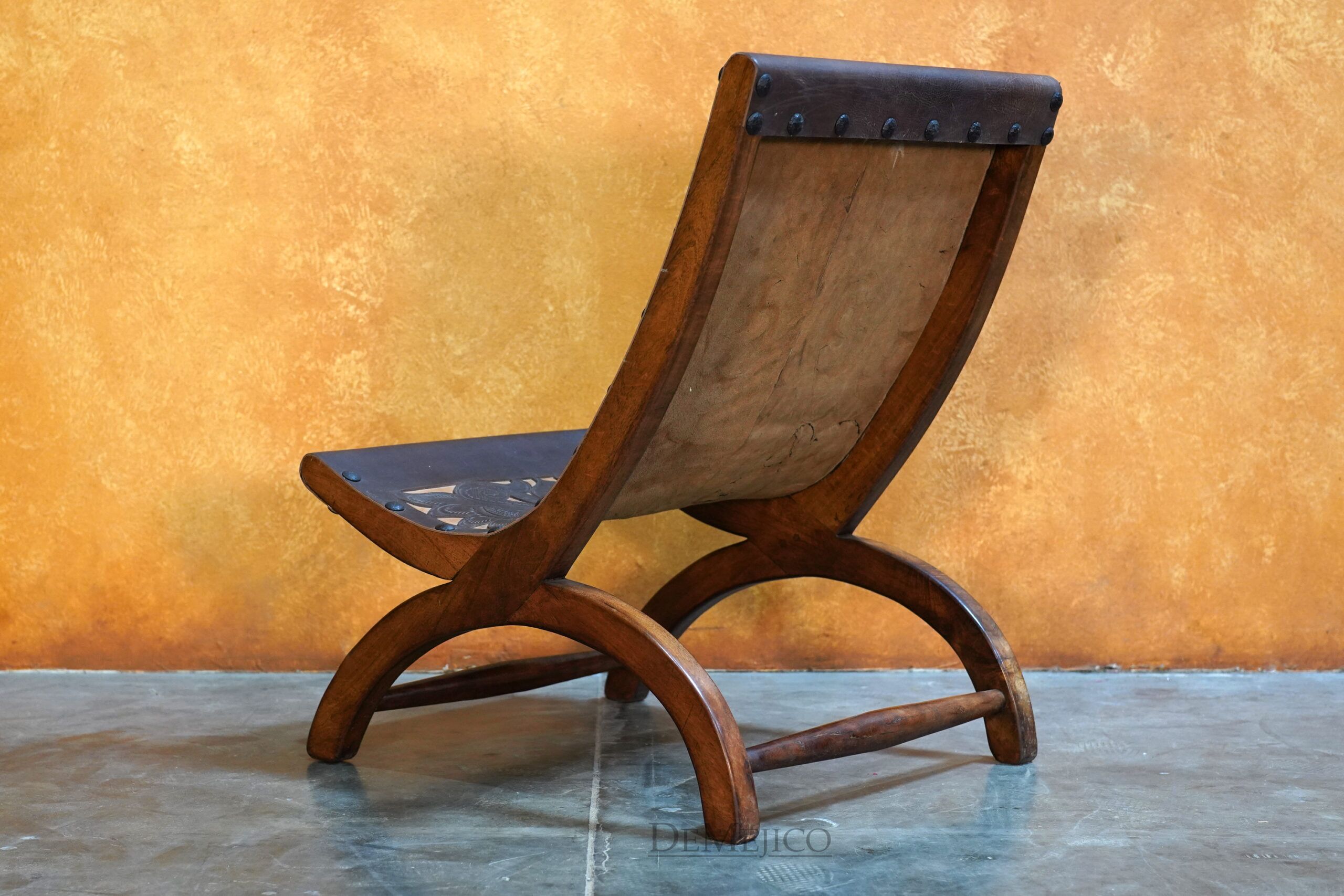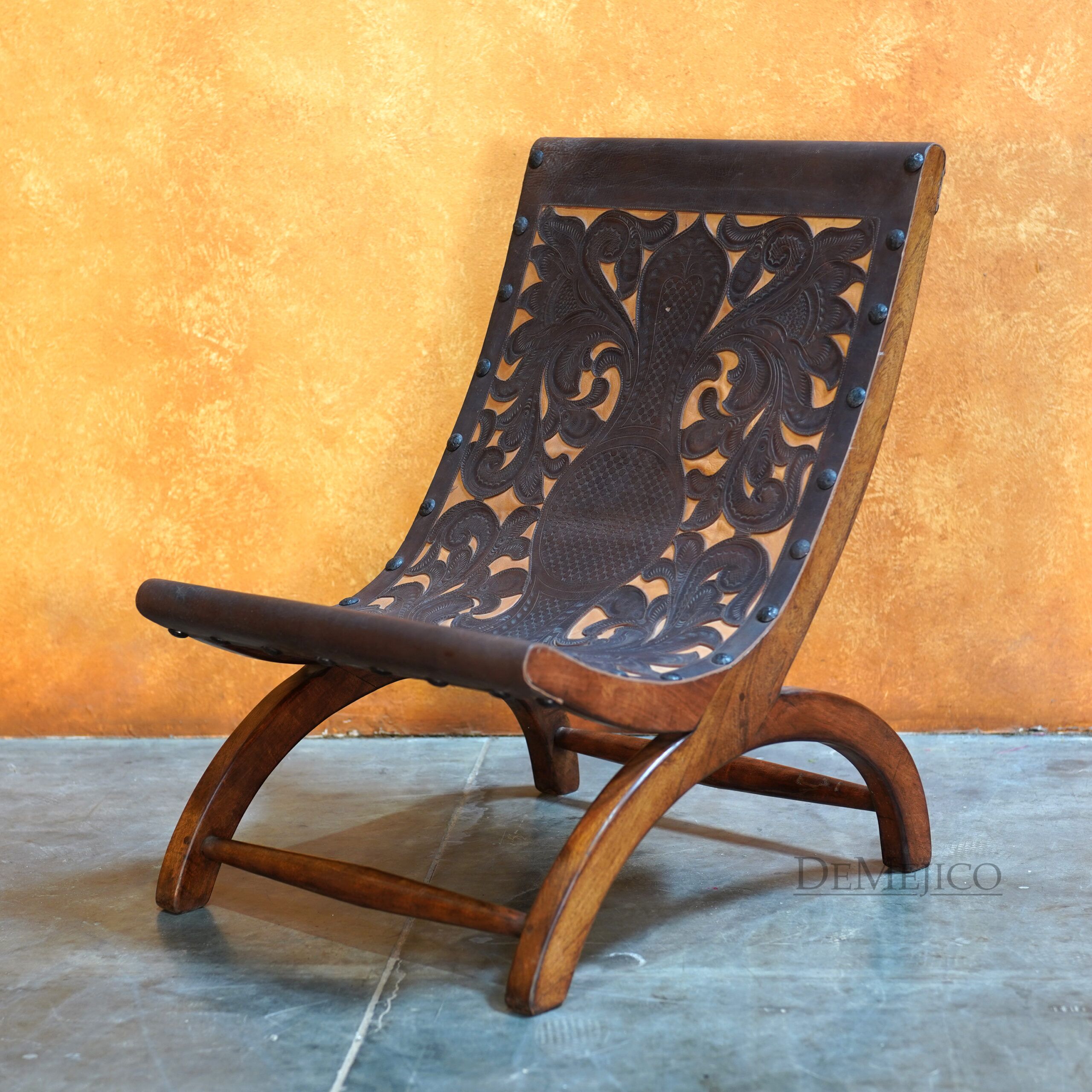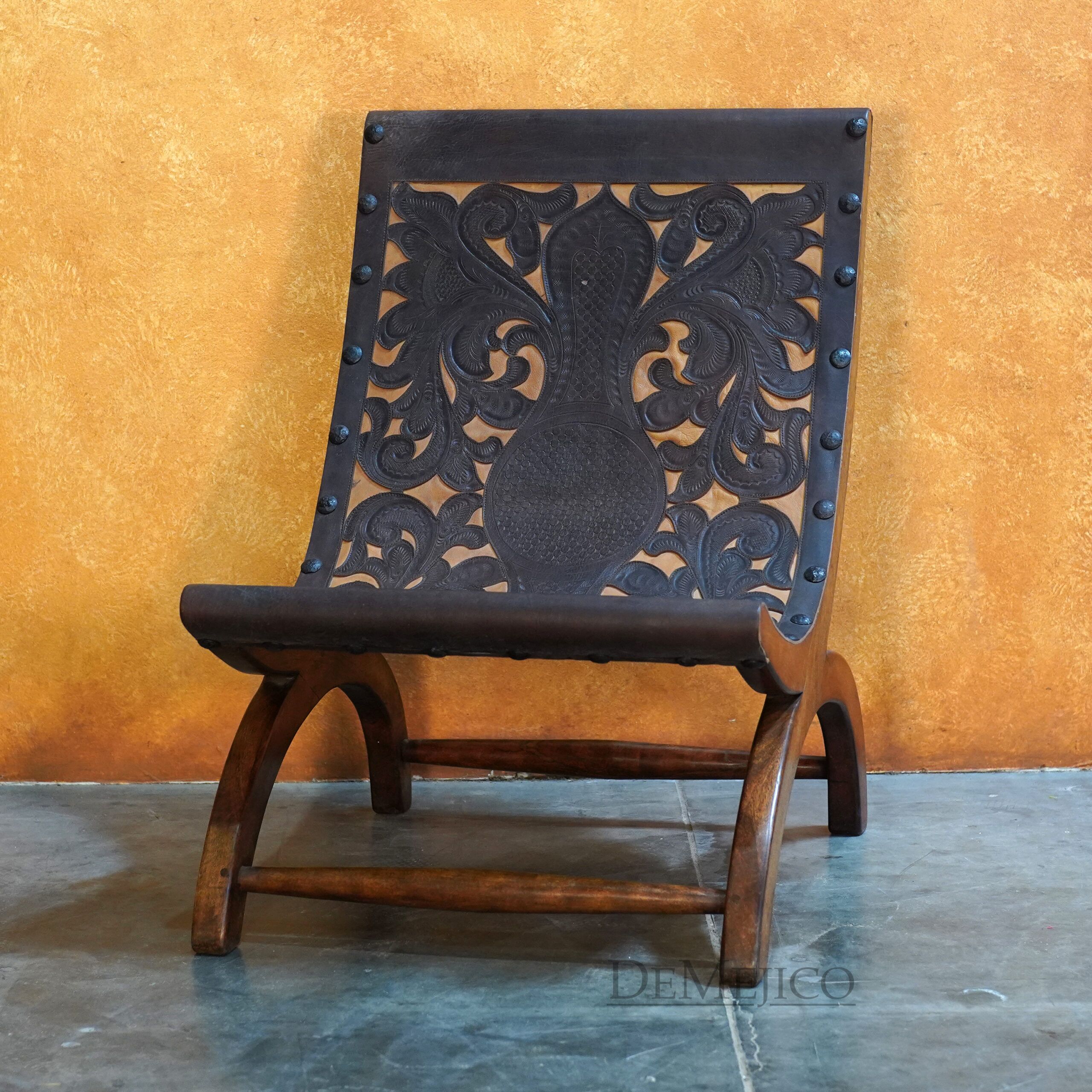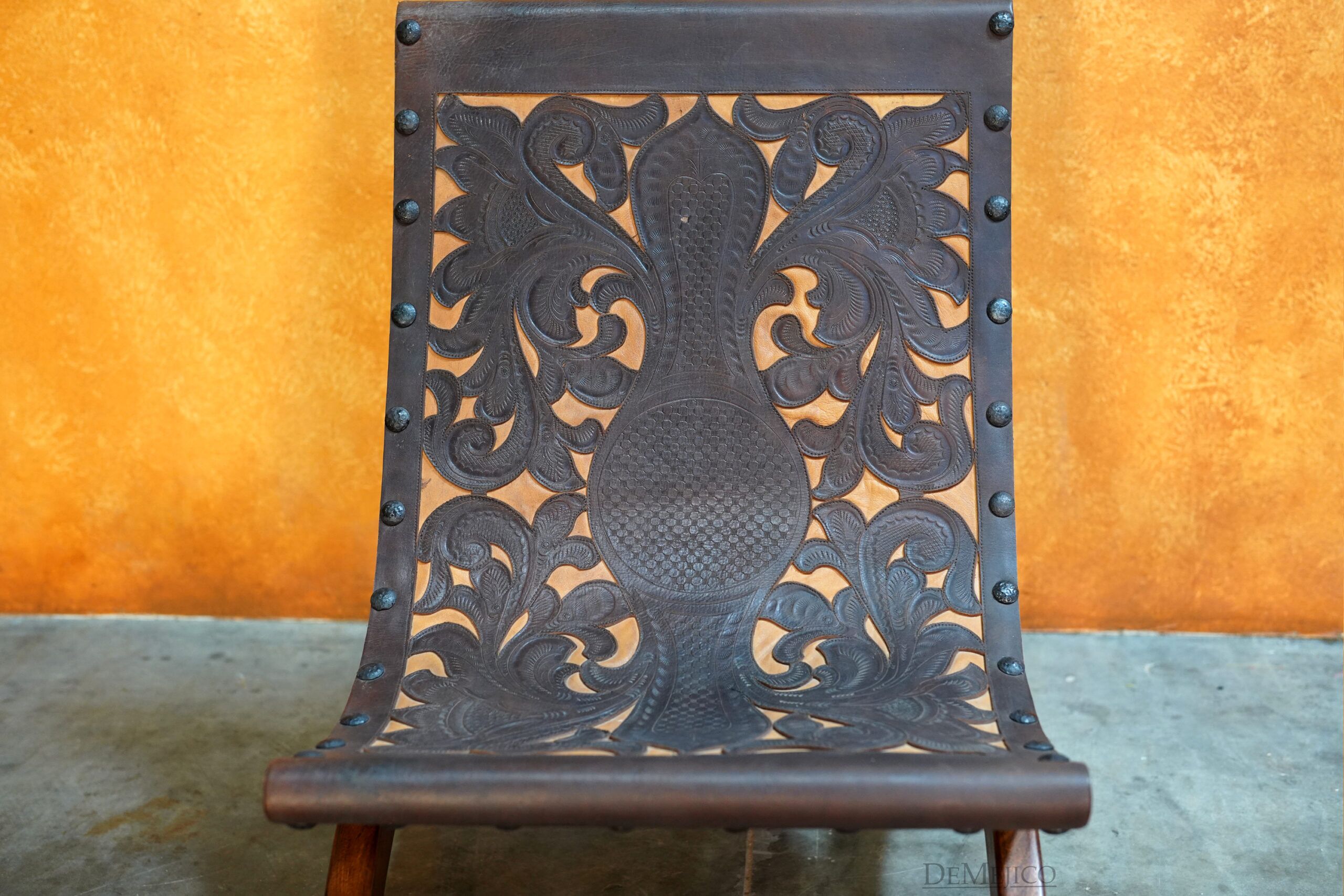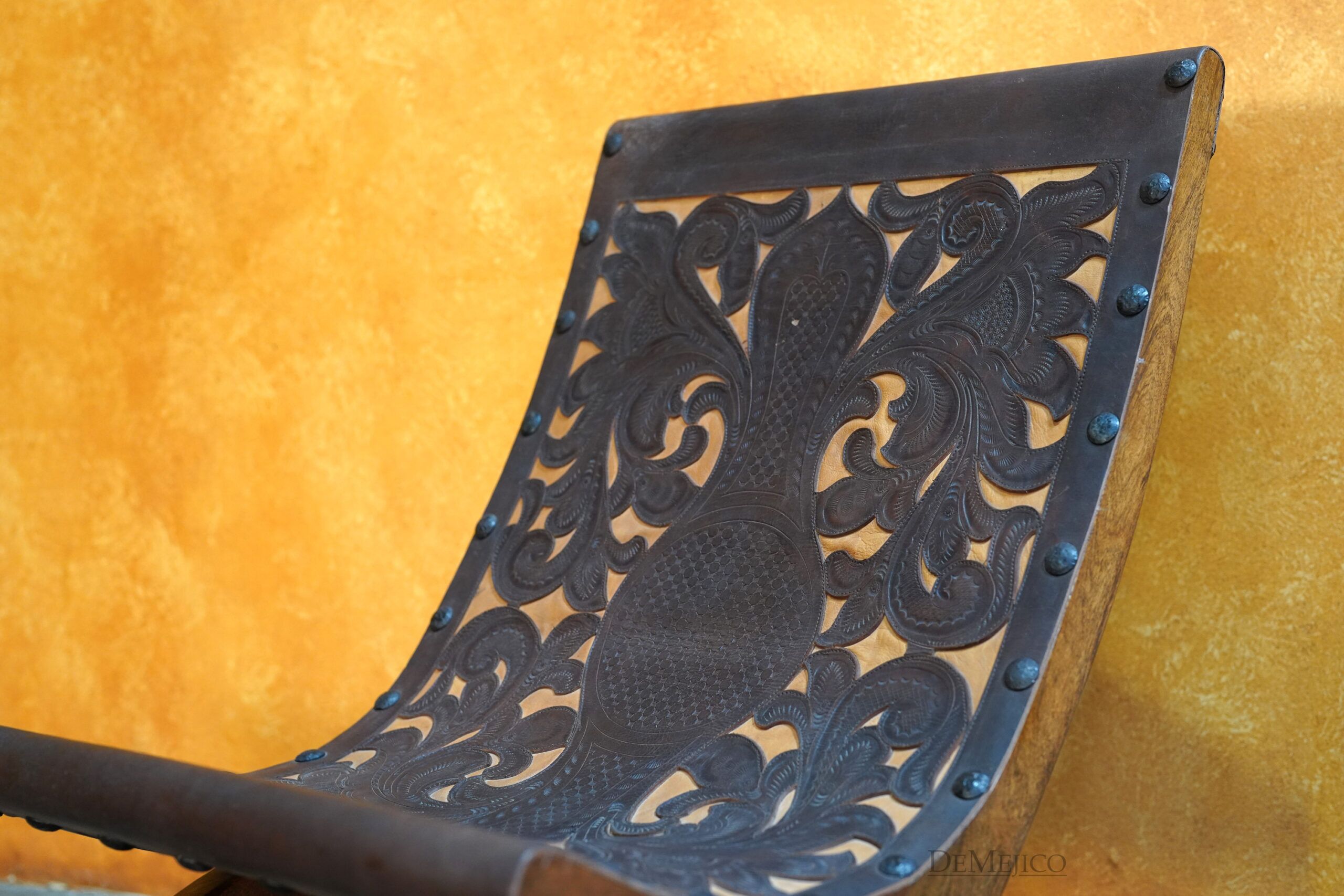 Newly designed, the Vaquero Silla Nayarit is a stylish and comfortable leather lounge chair featured in our Living Room Catalog. Taking inspiration from our classic Silla Nayarit Chairs, these Spanish chairs are also hand crafted with solid mesquite wood, and show off the same scooped style backrest and half moon shaped legs. This time however, the Vaquero Silla Nayarit grabs your attention with an intricately tooled leather backrest. The two toned leather shows off a beautiful Spanish design, which when seen up close shows off even more detail than you thought was there! Accented by hand pounded iron clavos along the edges, the Vaquero Silla Nayarit is the perfect touch to any Spanish styled living or entertainment space.